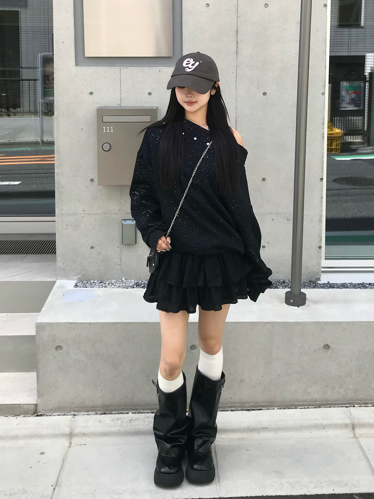 ほどよい肌見せが抜け感を演出し、きらめくラメ素材がコーディネートに華やかさをプラス。