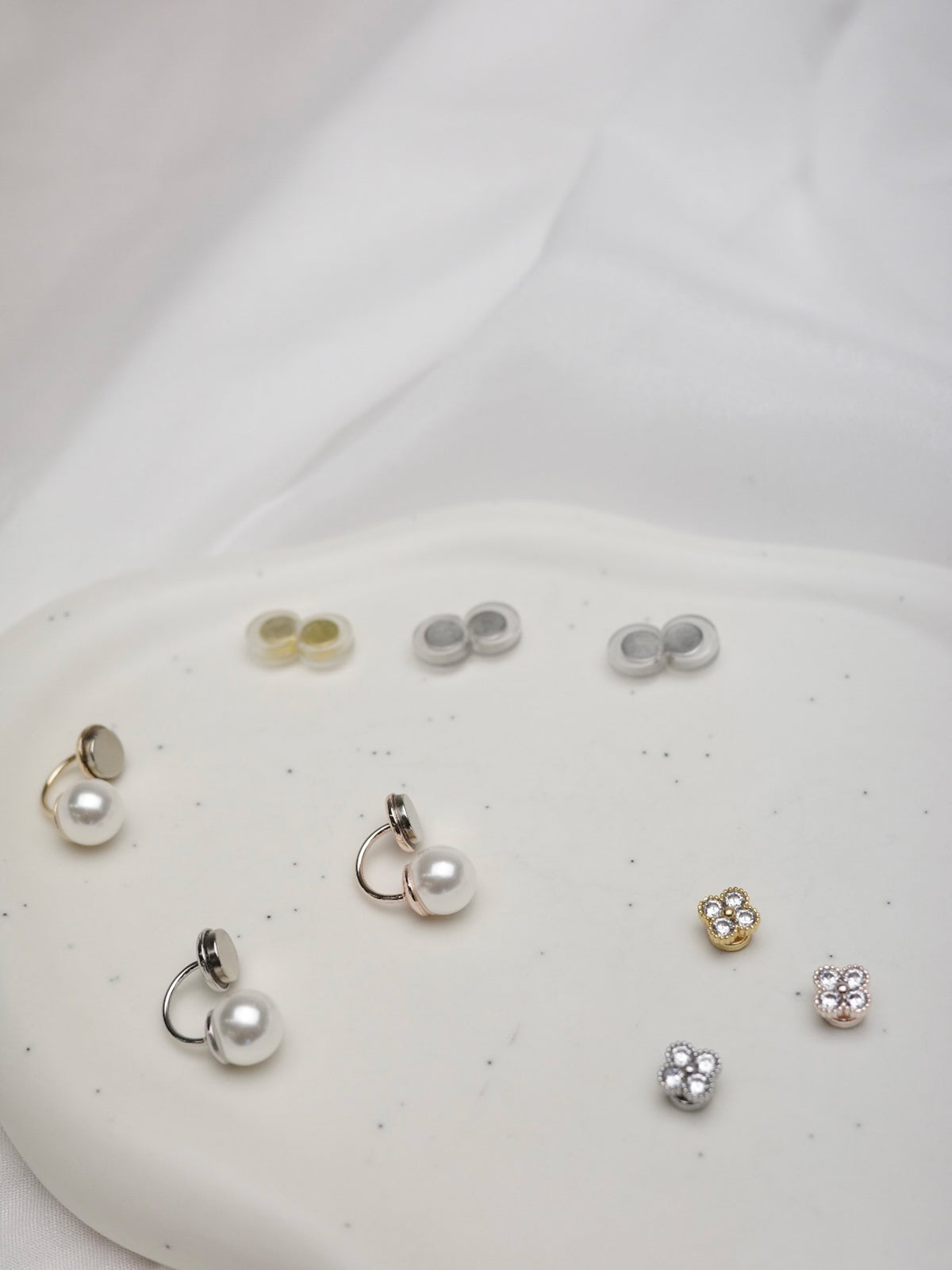 シーンに合わせて付け替えられる2WAY仕様で、存在感のあるパール付きと、シンプルなマグネットだけのスタイルの2パターンをお楽しみいただけます。