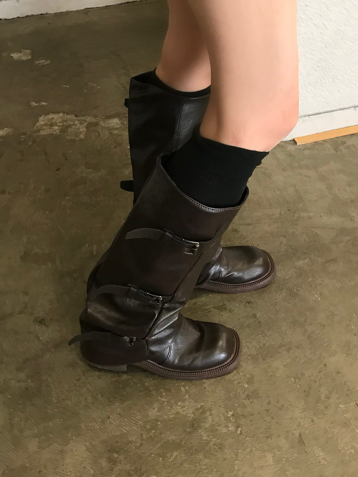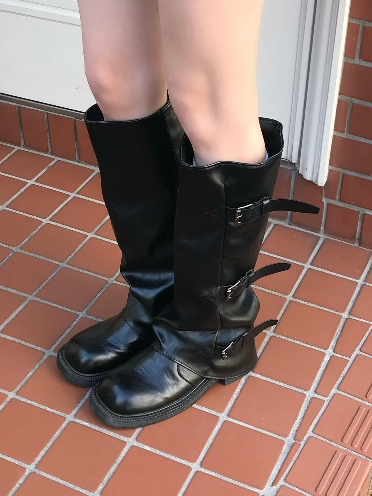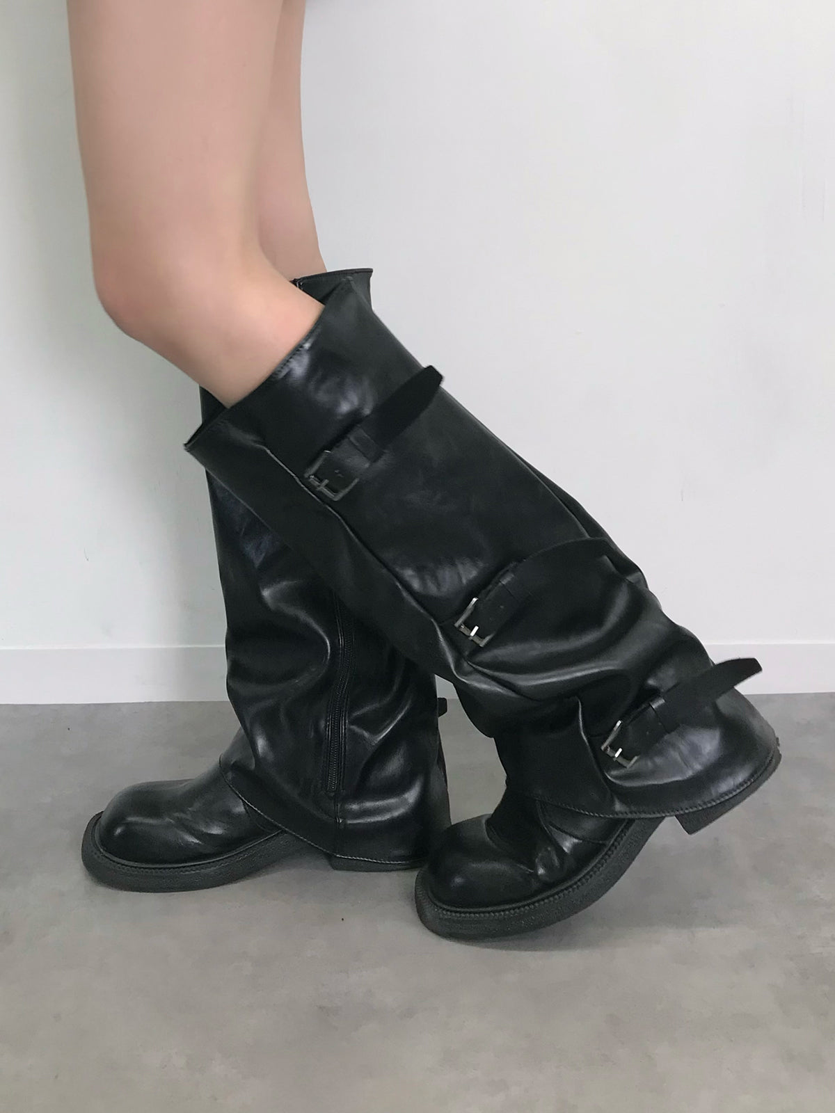 エッジの効いたベルトデティールがアクセントのカバーロングブーツ。