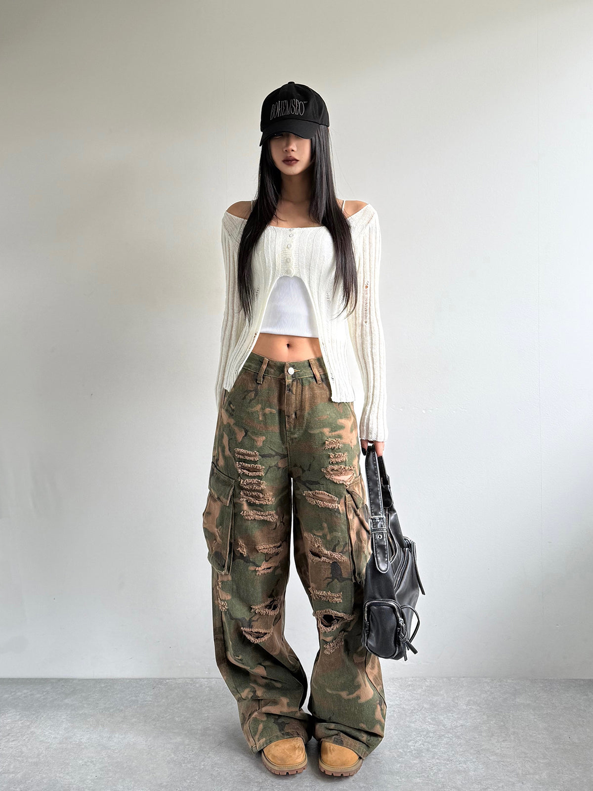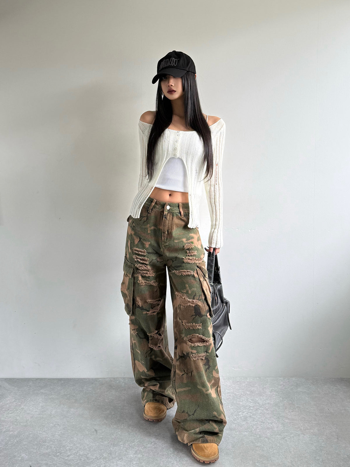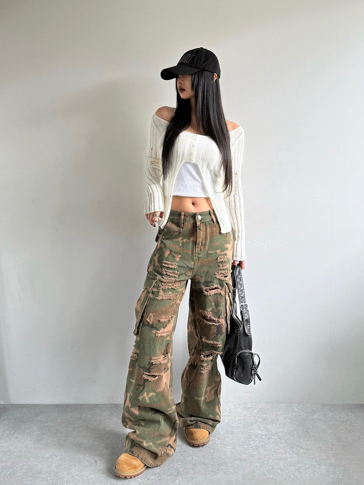 コーデにアクセントをプラスする、存在感のあるカモフラージュデザインのパンツ。