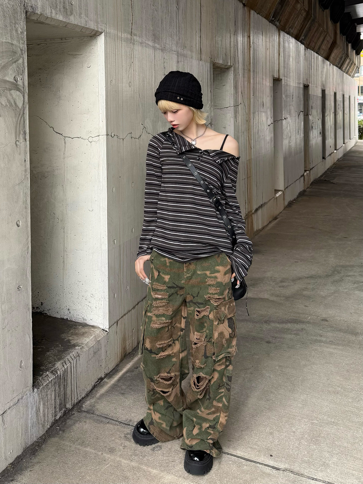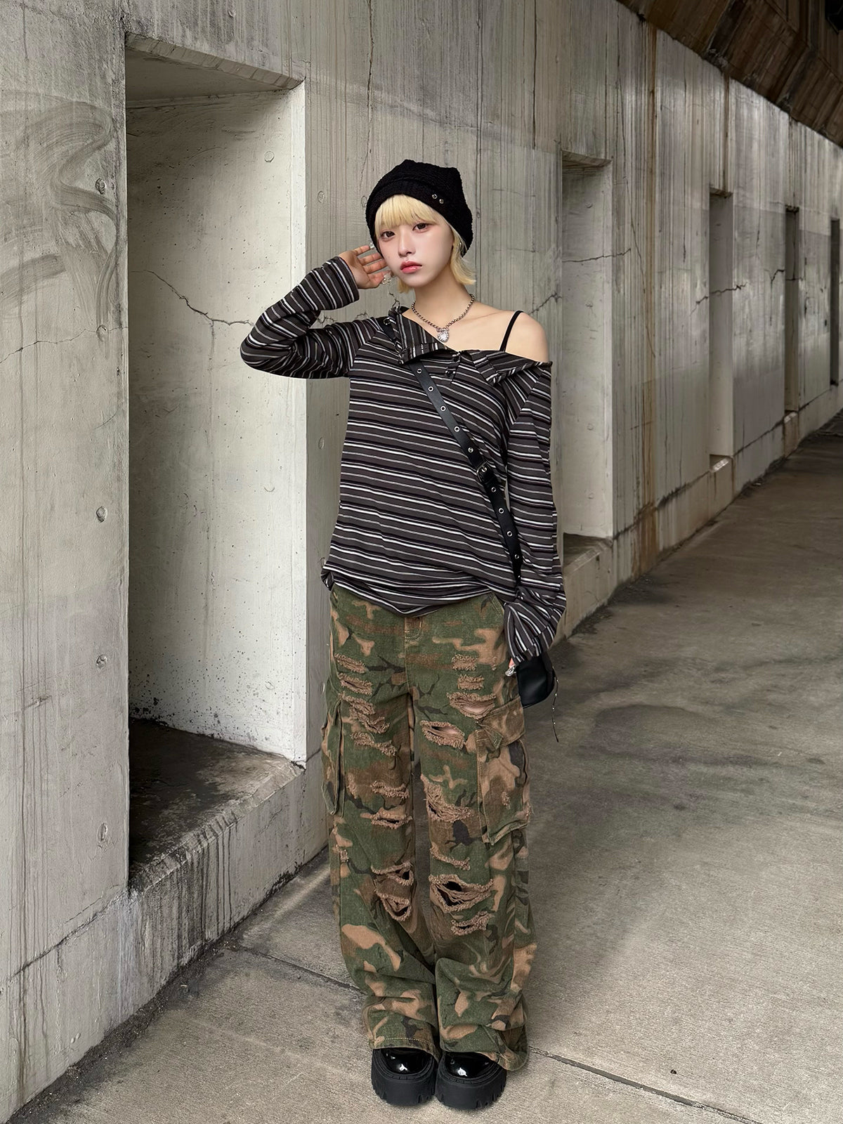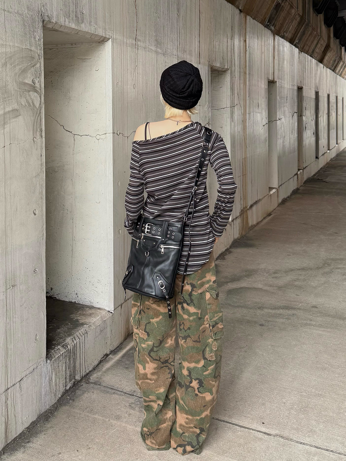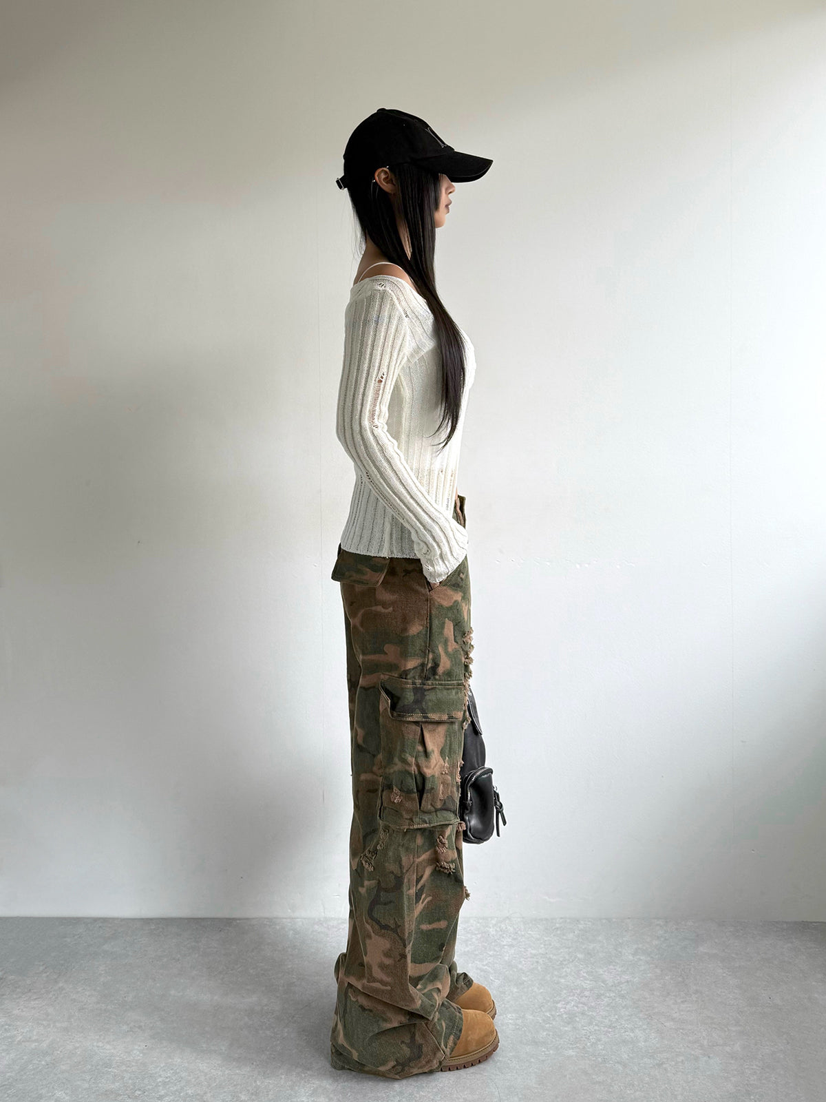 コーデにアクセントをプラスする、存在感のあるカモフラージュデザインのパンツ。