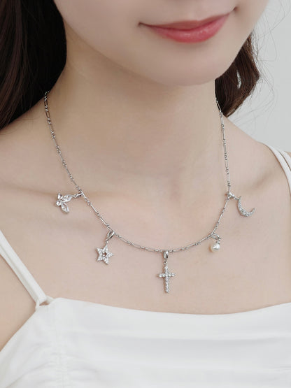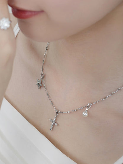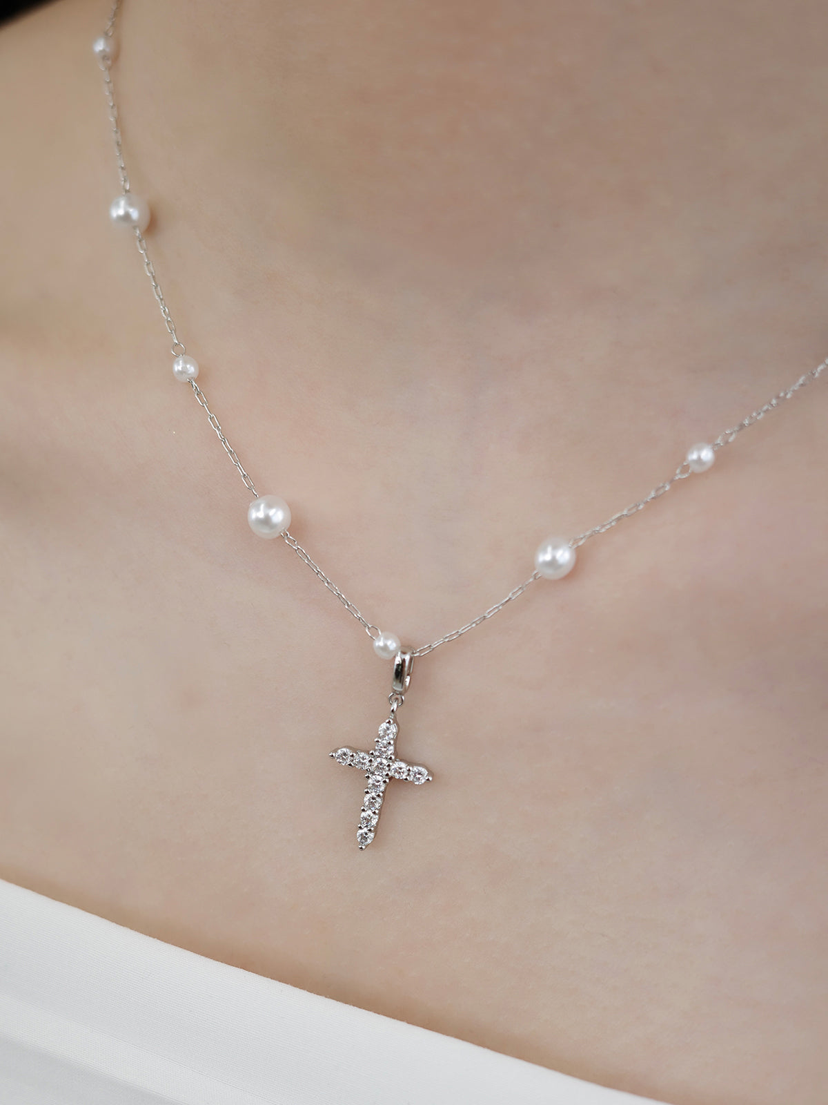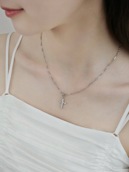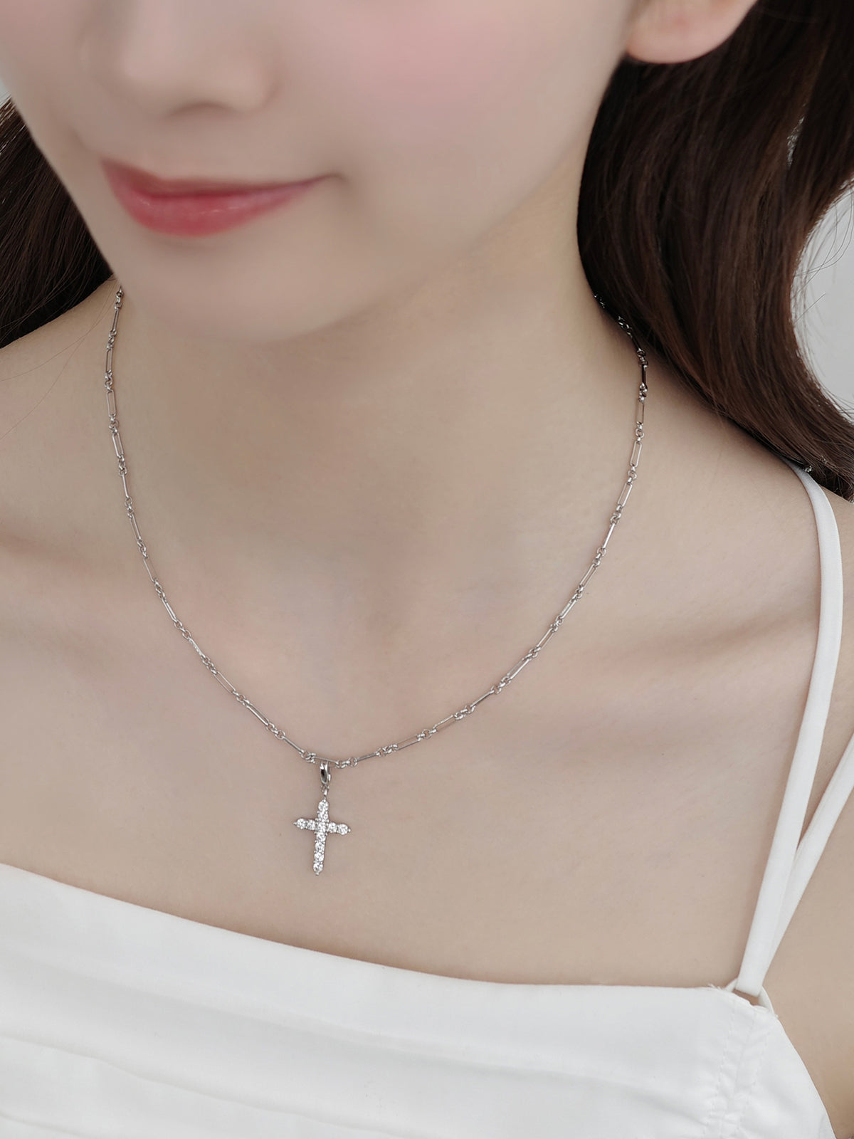 繊細な輝きが胸元を彩る、洗練されたキュービッククロスチャーム。