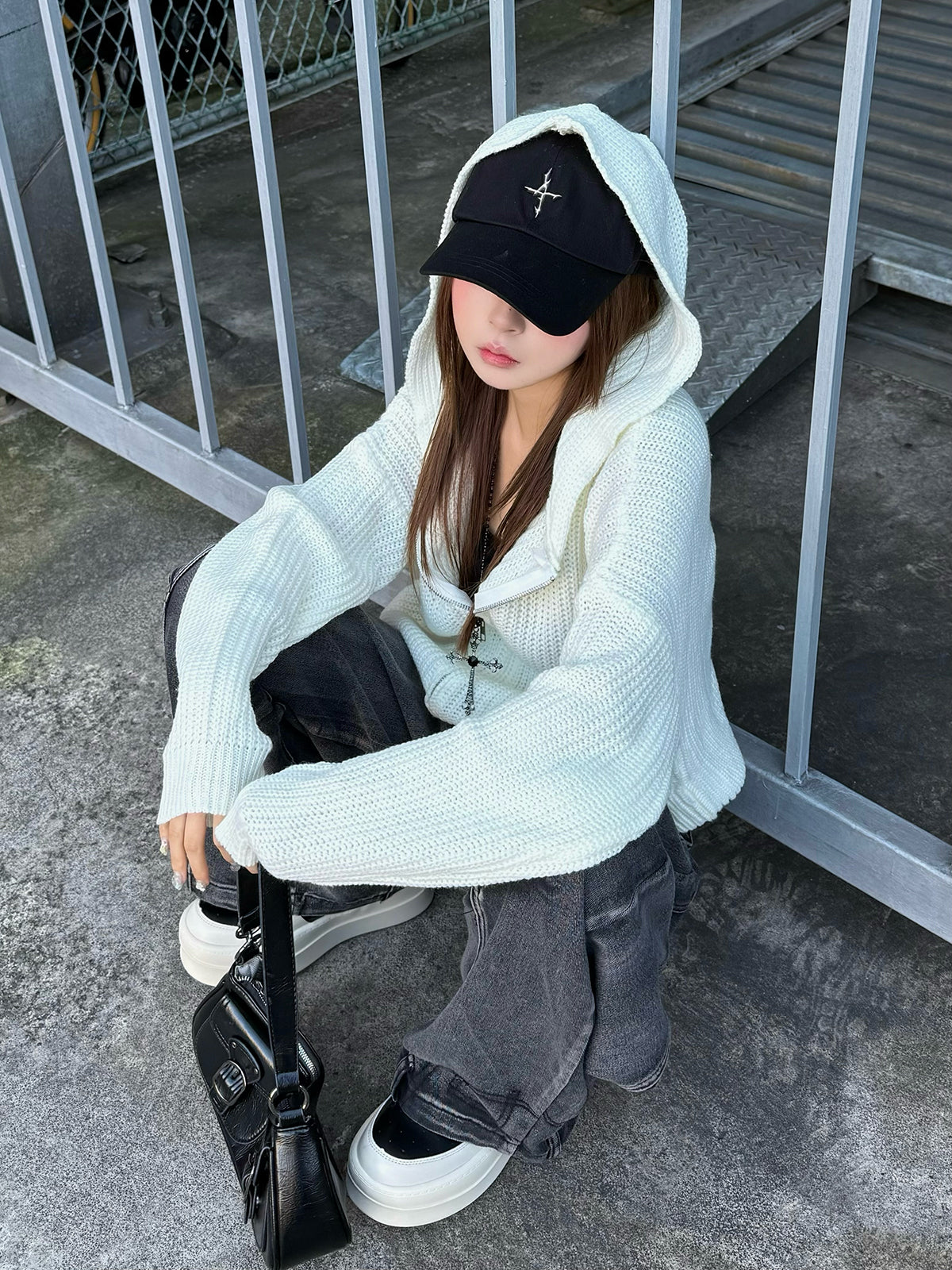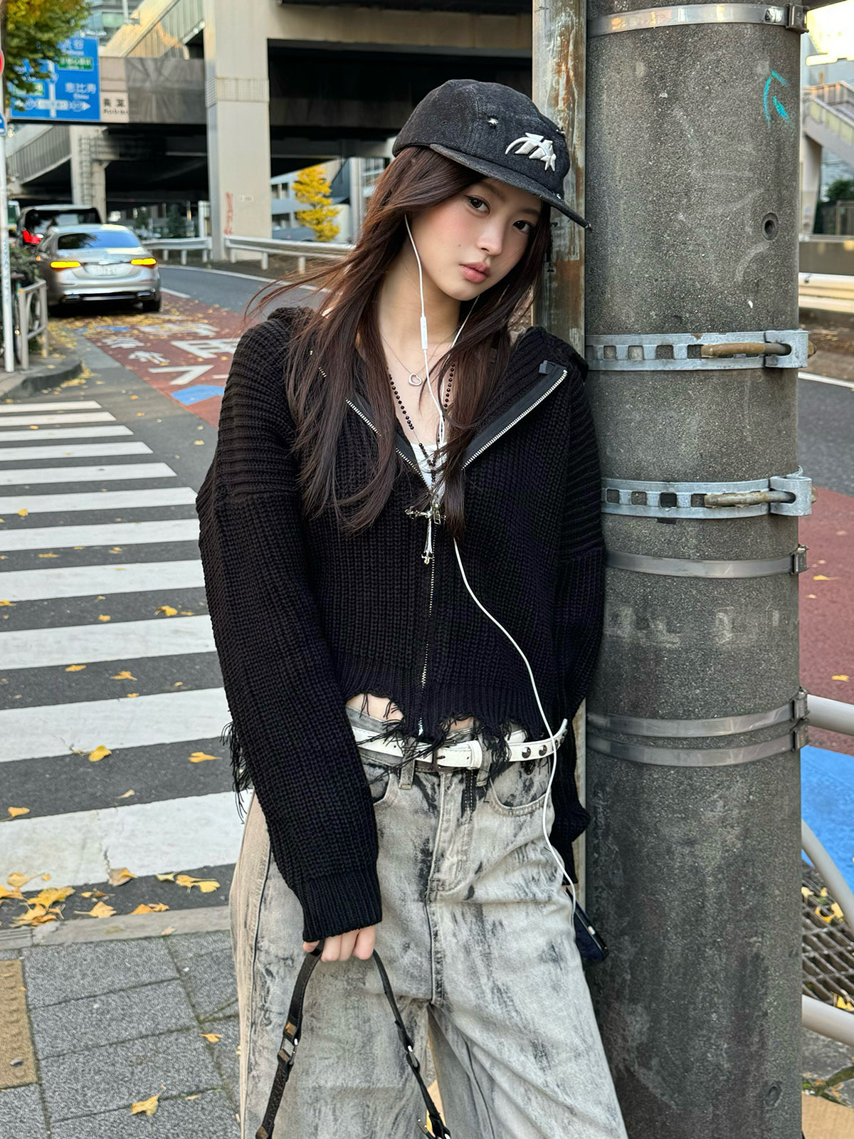 ざっくりとした編地に、フリンジを加えたダメージ加工がアクセントになるニットパーカー。