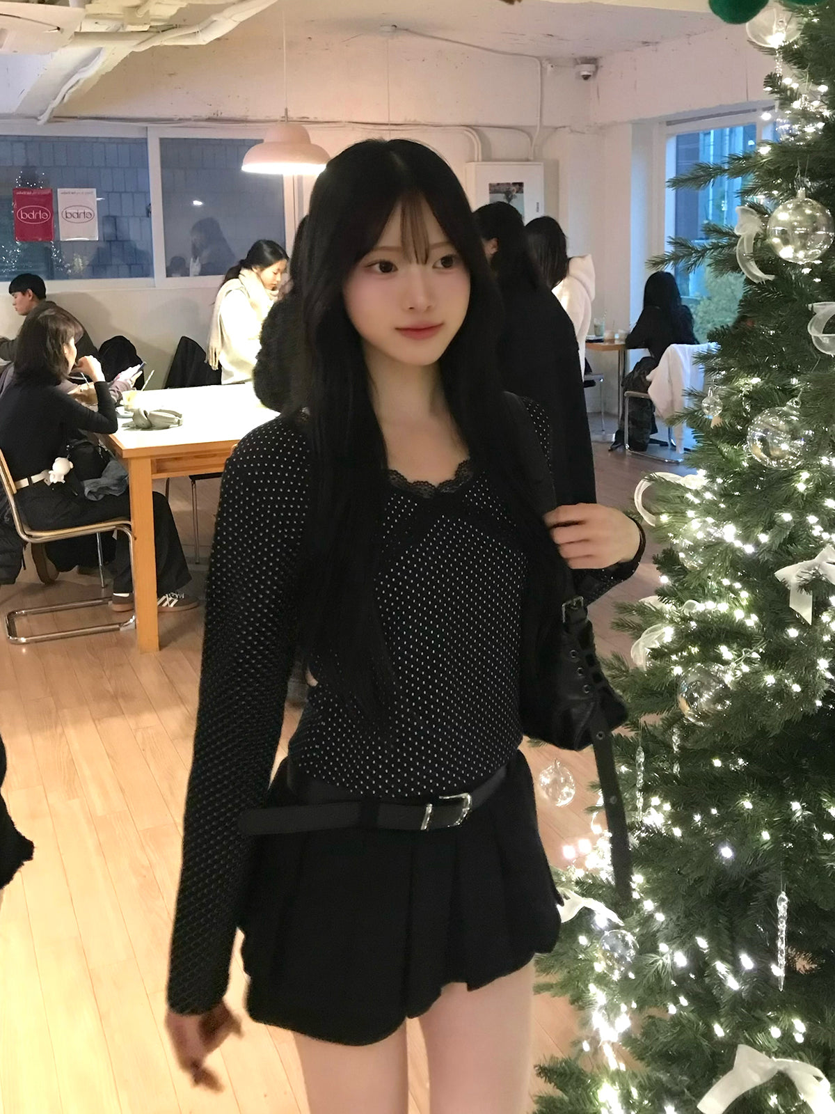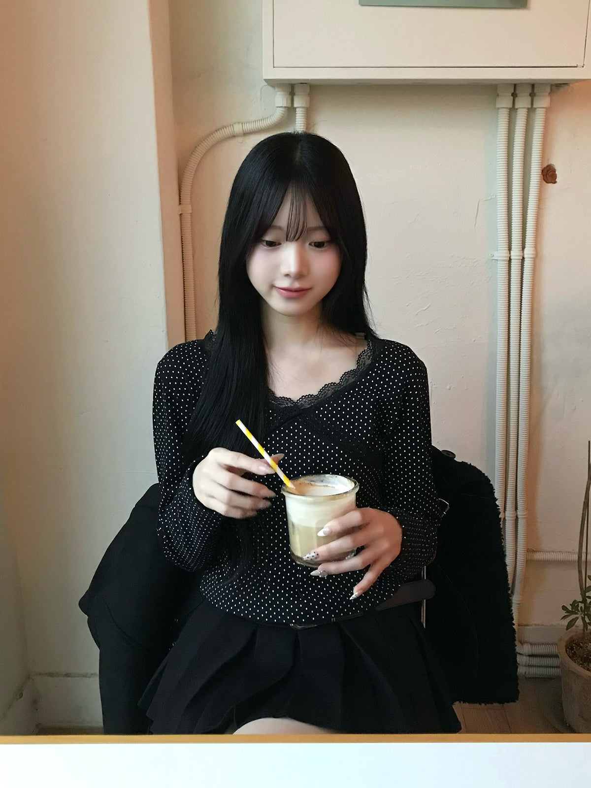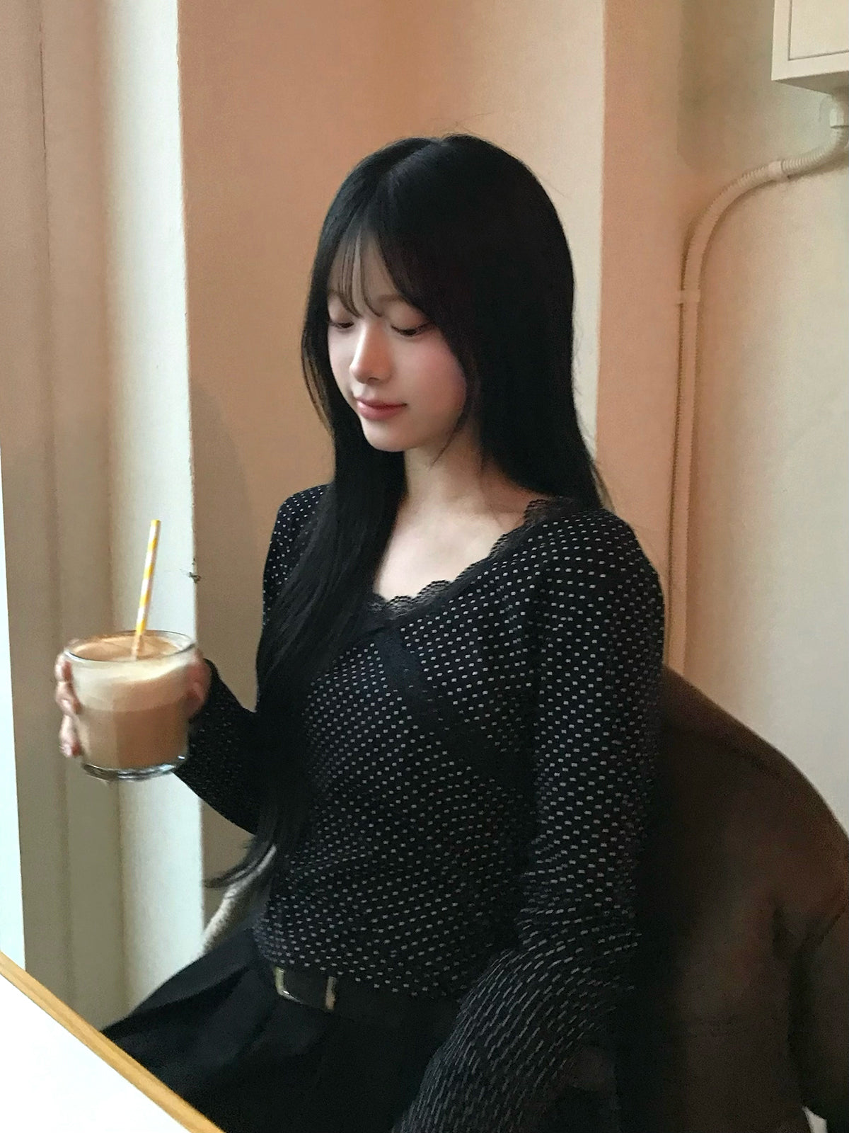 Vネックのラインがデコルテをきれいに見せ、顔周りもすっきりとした印象に。