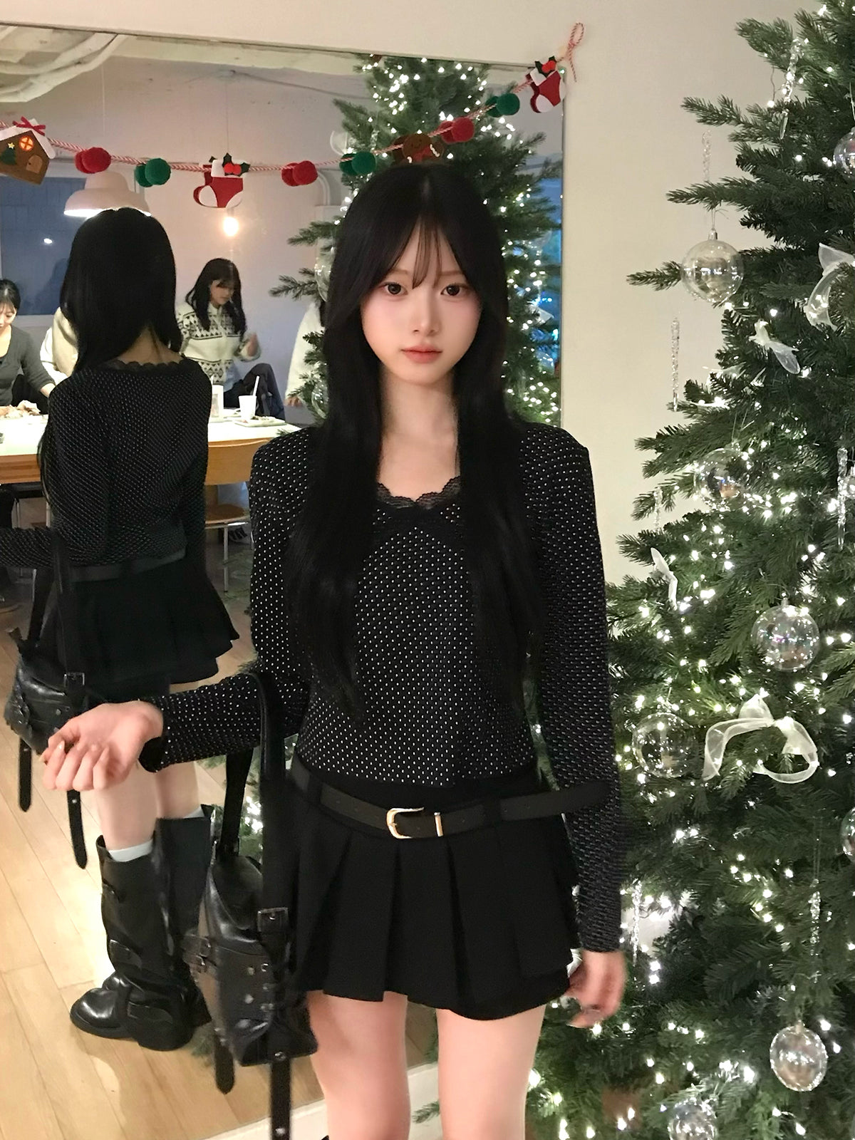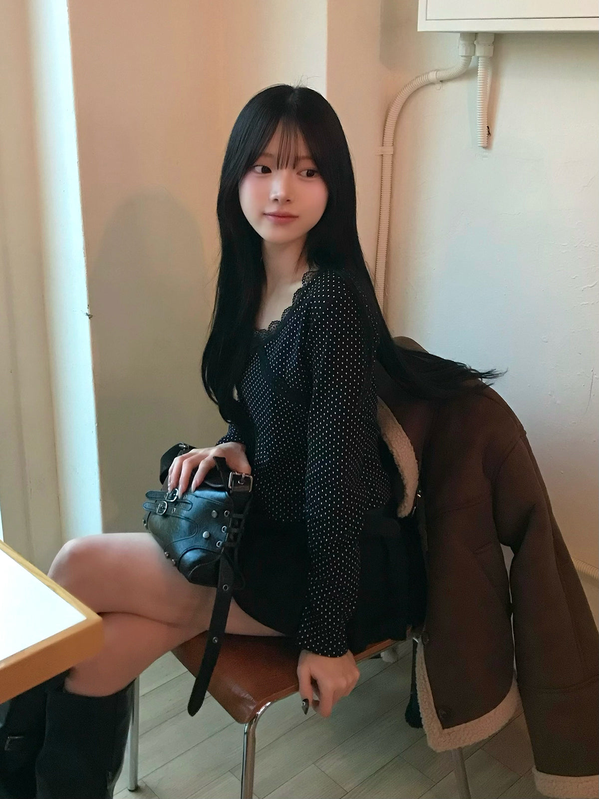 細かなドット柄を使用し、フロントにはクロスディテールのレースを施した華やぎのあるカットソー。