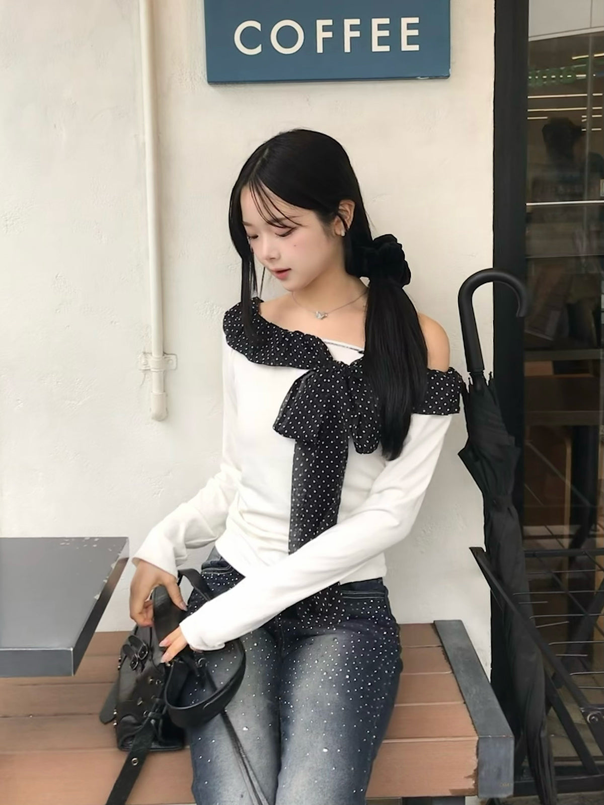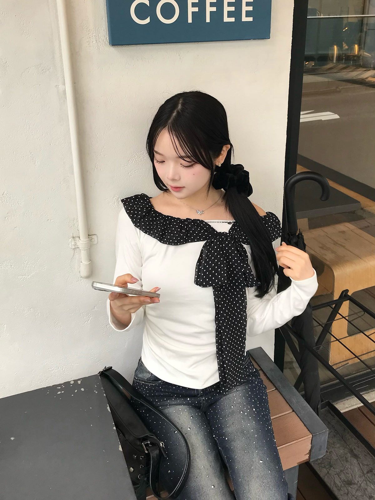 シアーなドットリボンが目を惹く、オフショルカットソー。