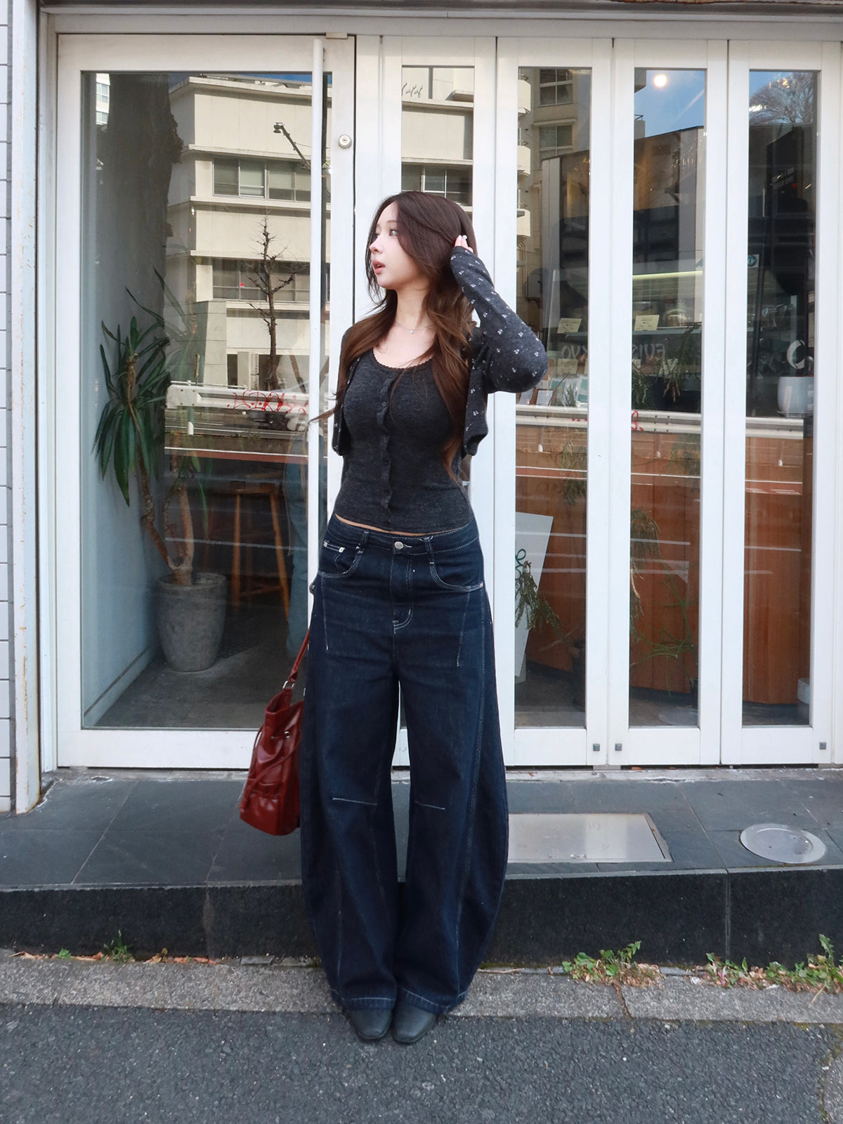 クロップド丈のカーディガンがバランスよく、自然とスタイルアップを叶えます。