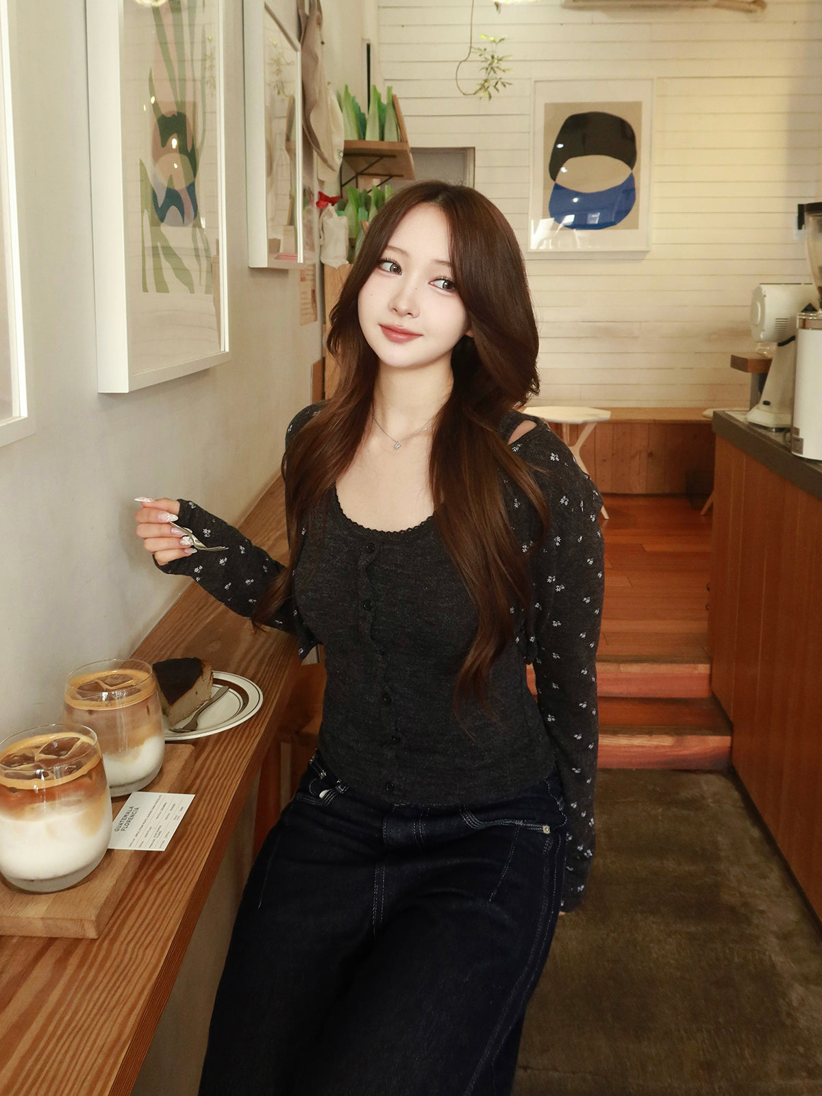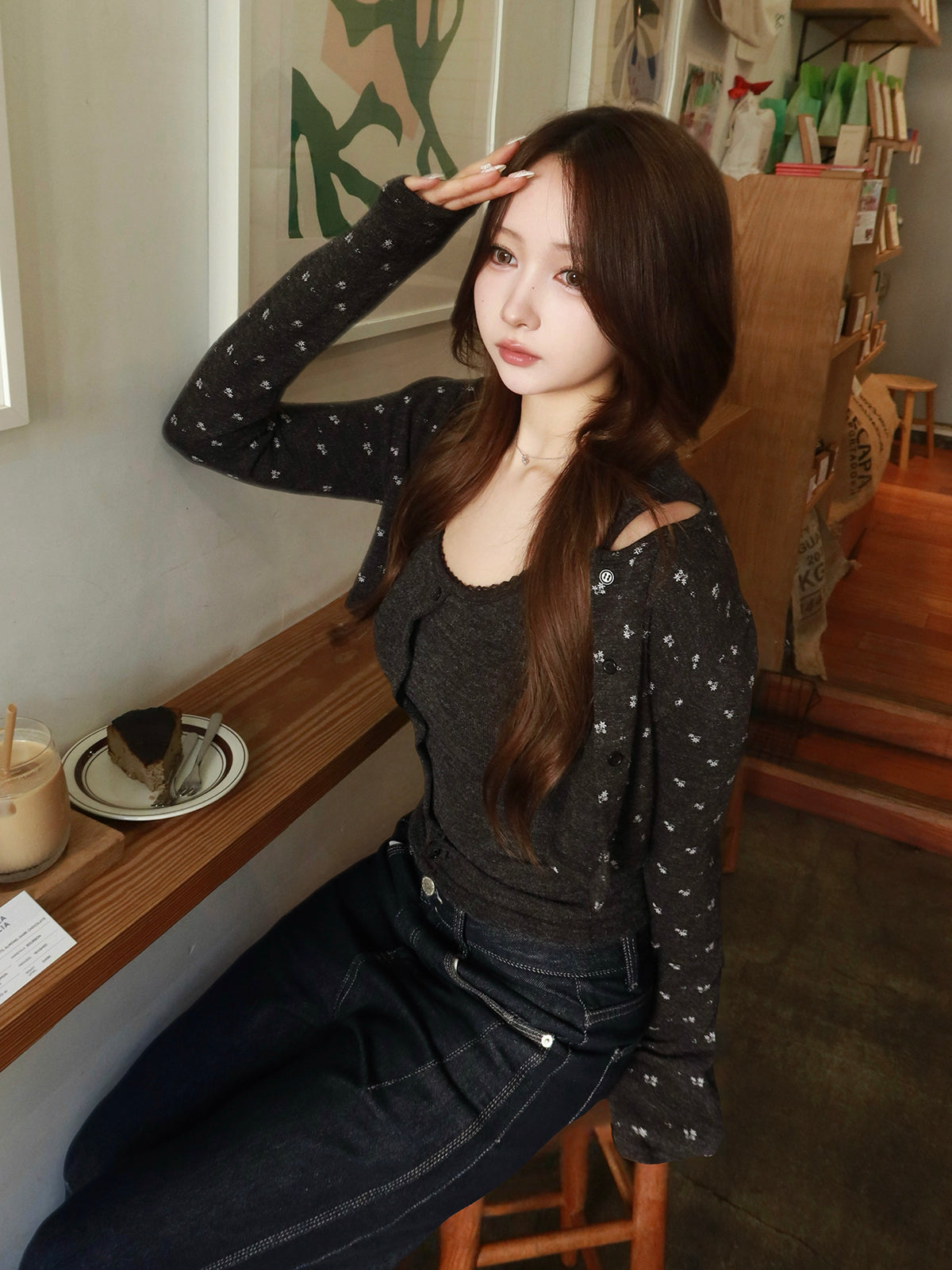 レースインナーとフラワーデザインのカーディガンを組み合わせたアンサンブルアイテム。