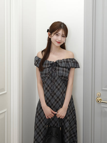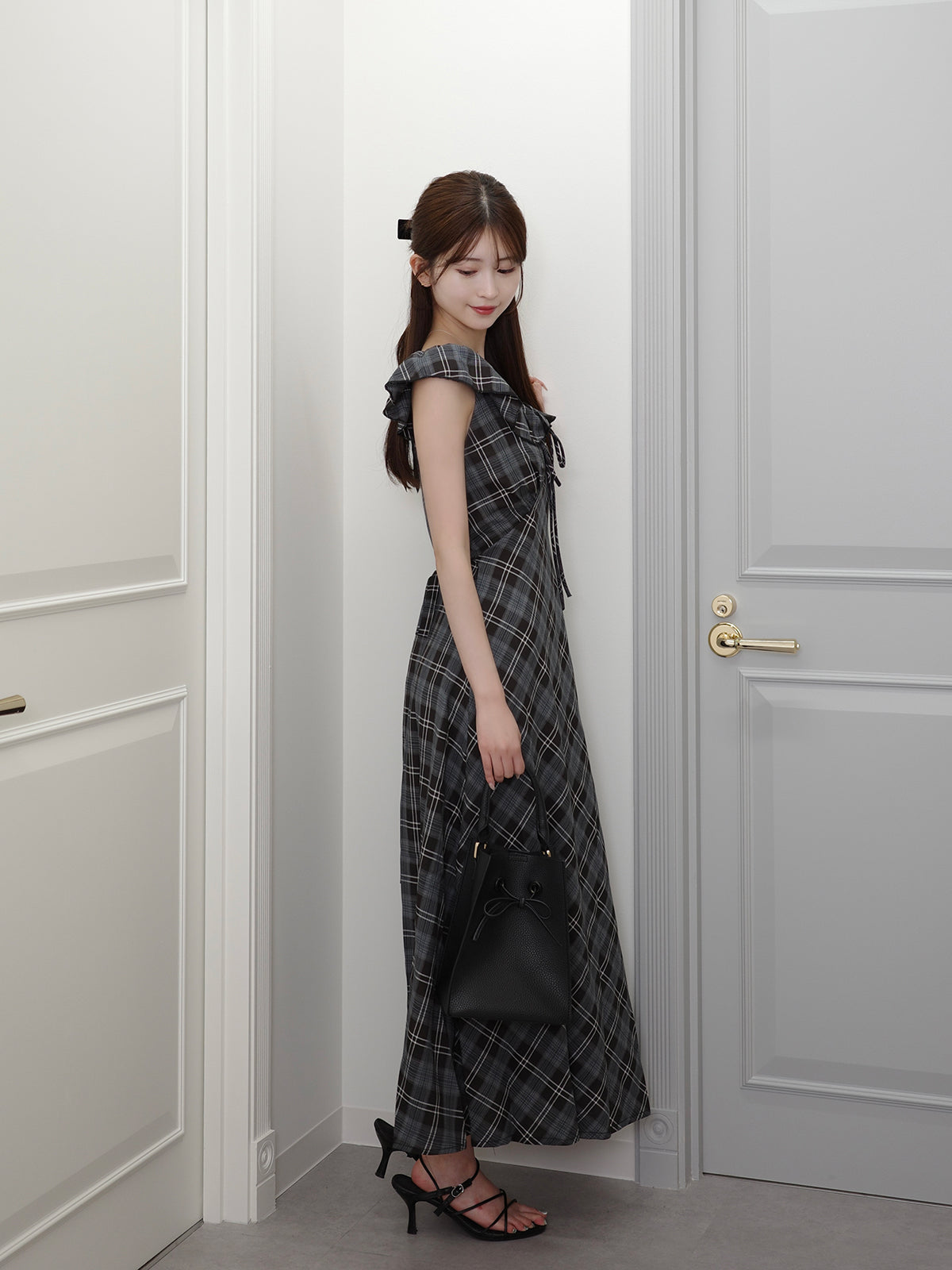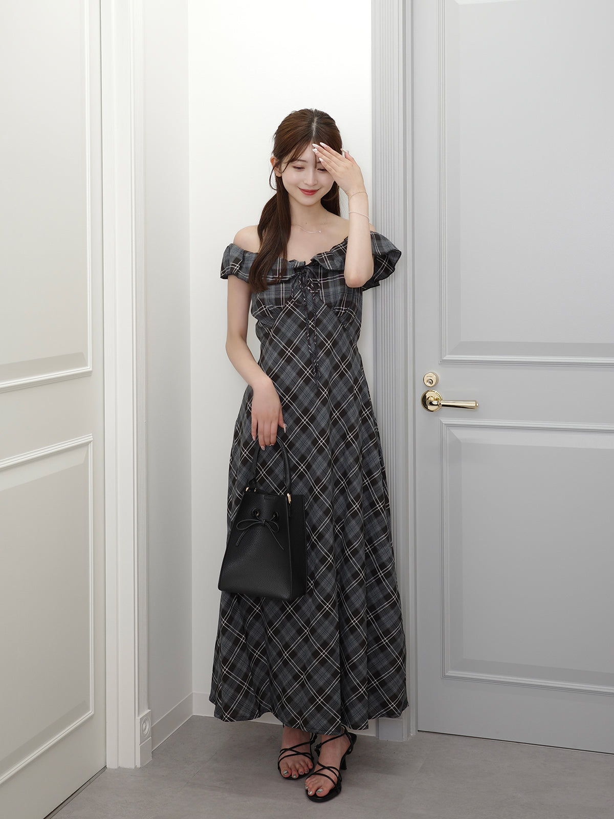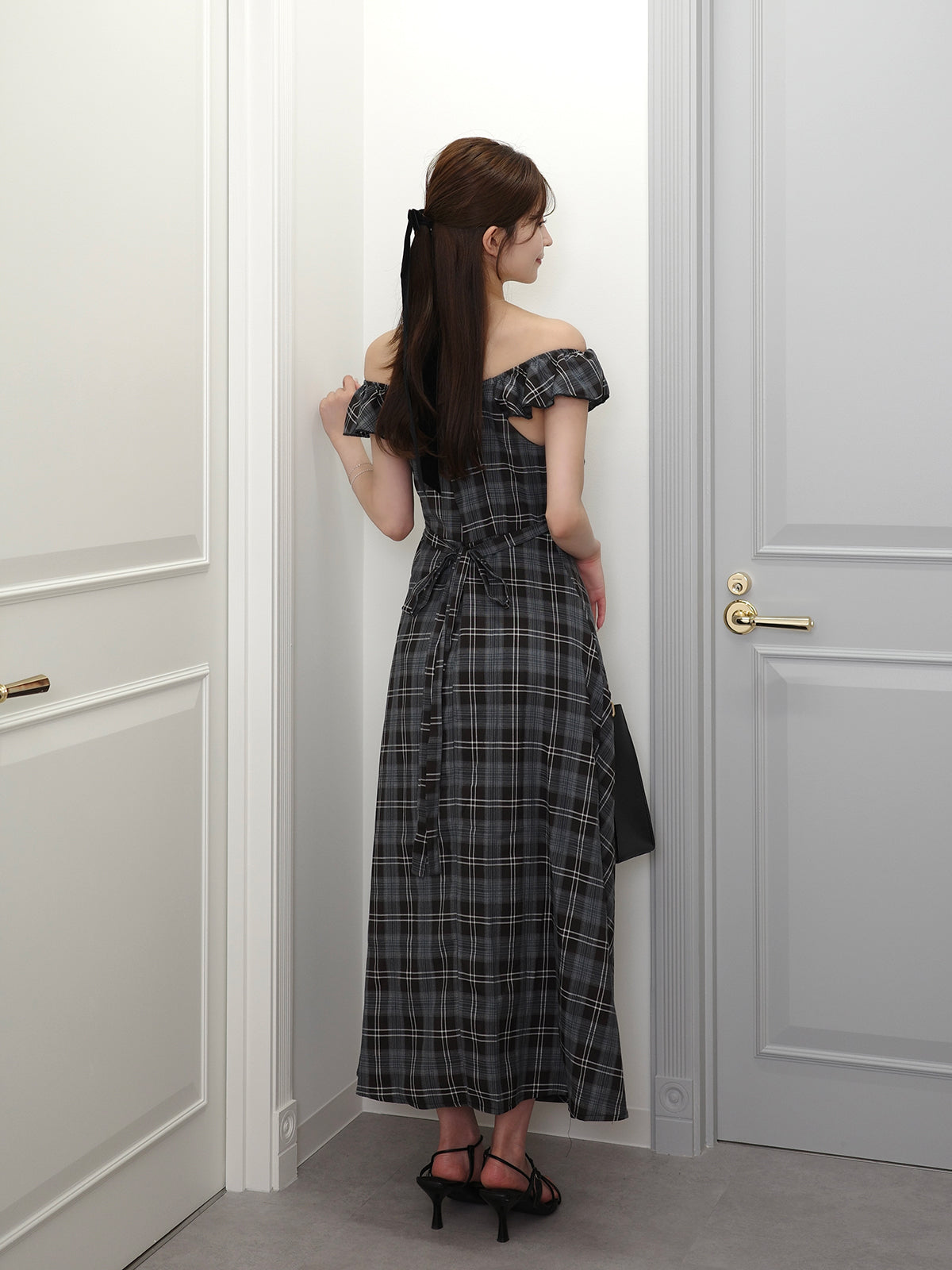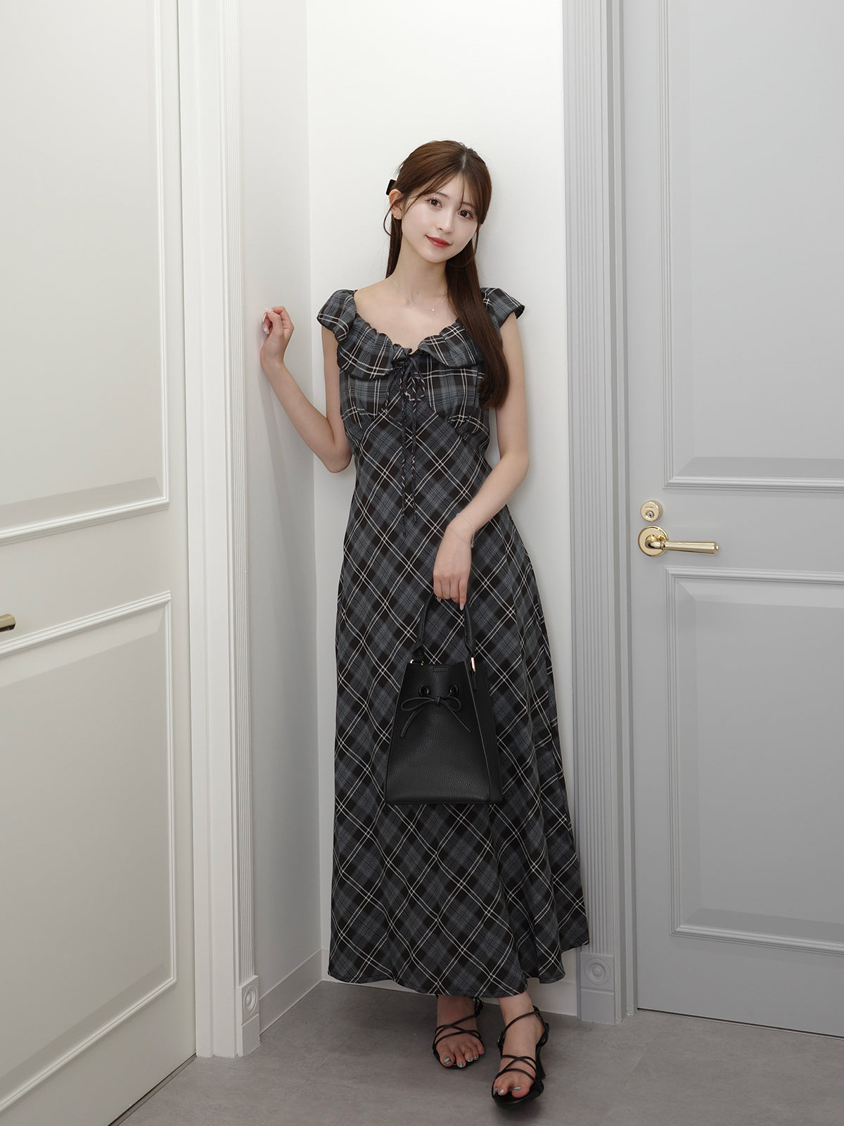 クラシカルなチェック柄と、デコルテをきれいに見せるフリルカラーデザインが印象的なワンピース。