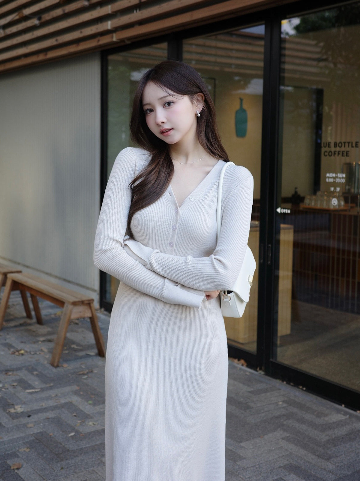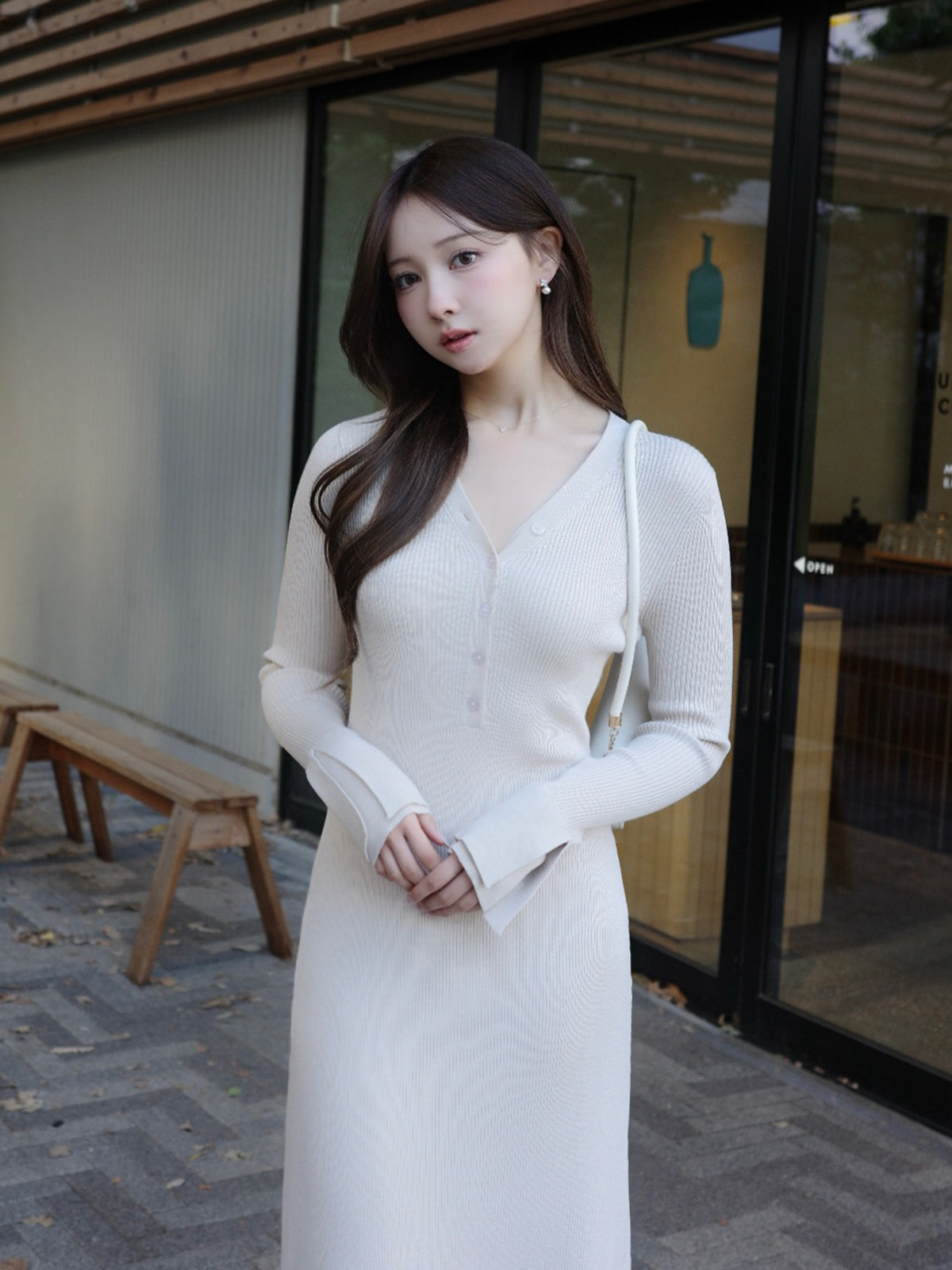フロントに並んだボタンとVネックが縦ラインを強調し、すっきりとした印象に仕上げます。