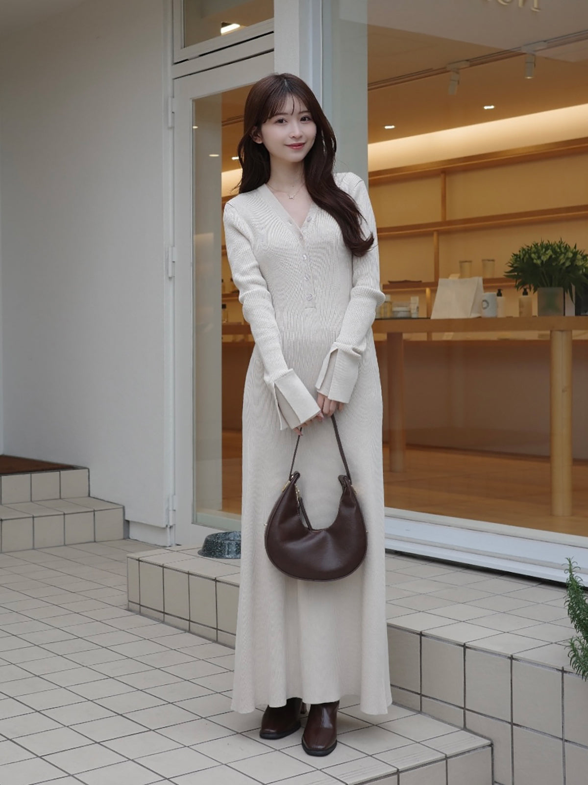 スカート部分は自然に広がるフレアシルエットで、袖口にはスリットを入れて軽やかな抜け感をプラス。