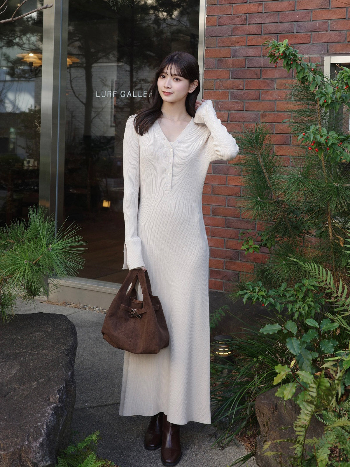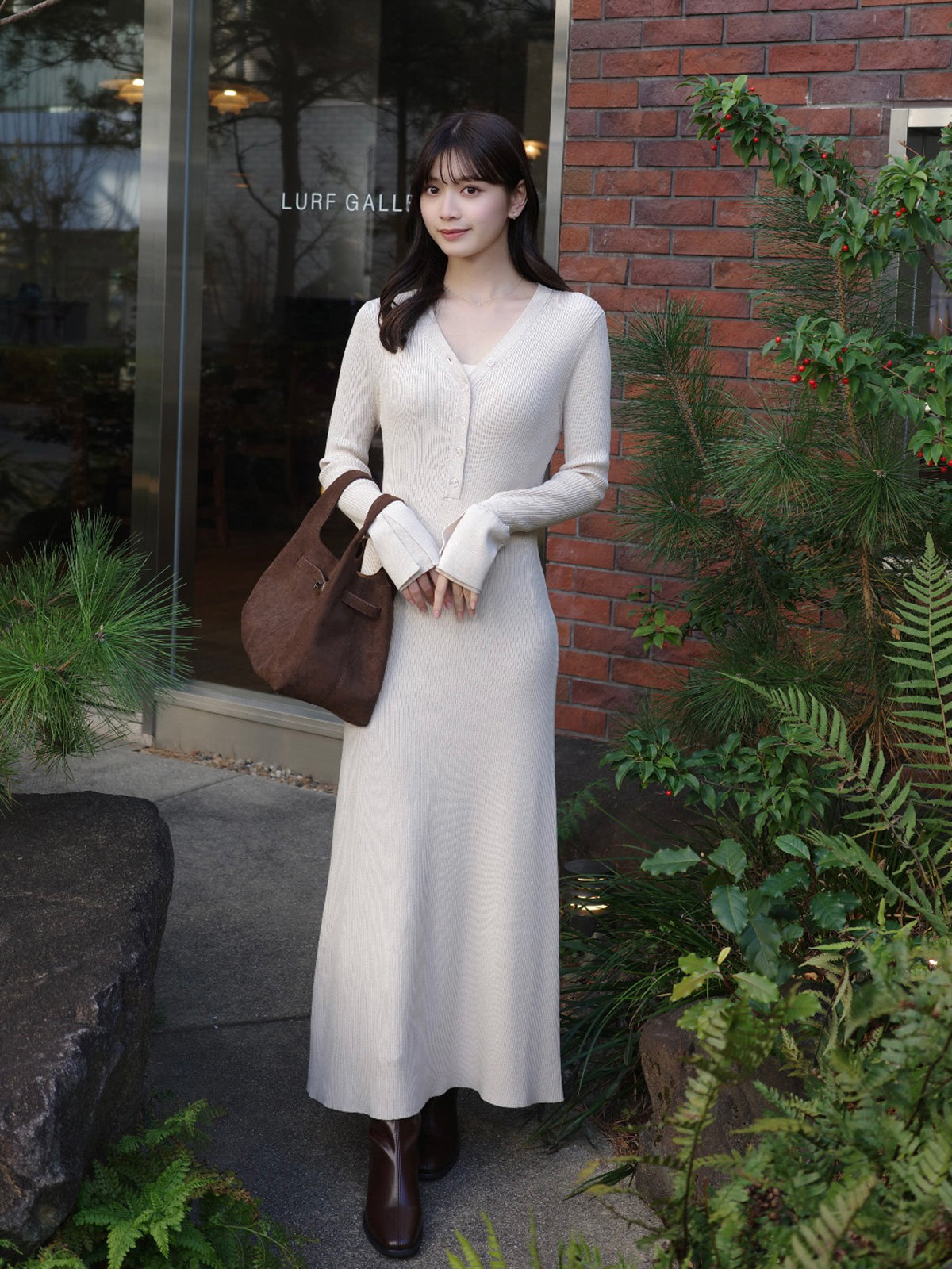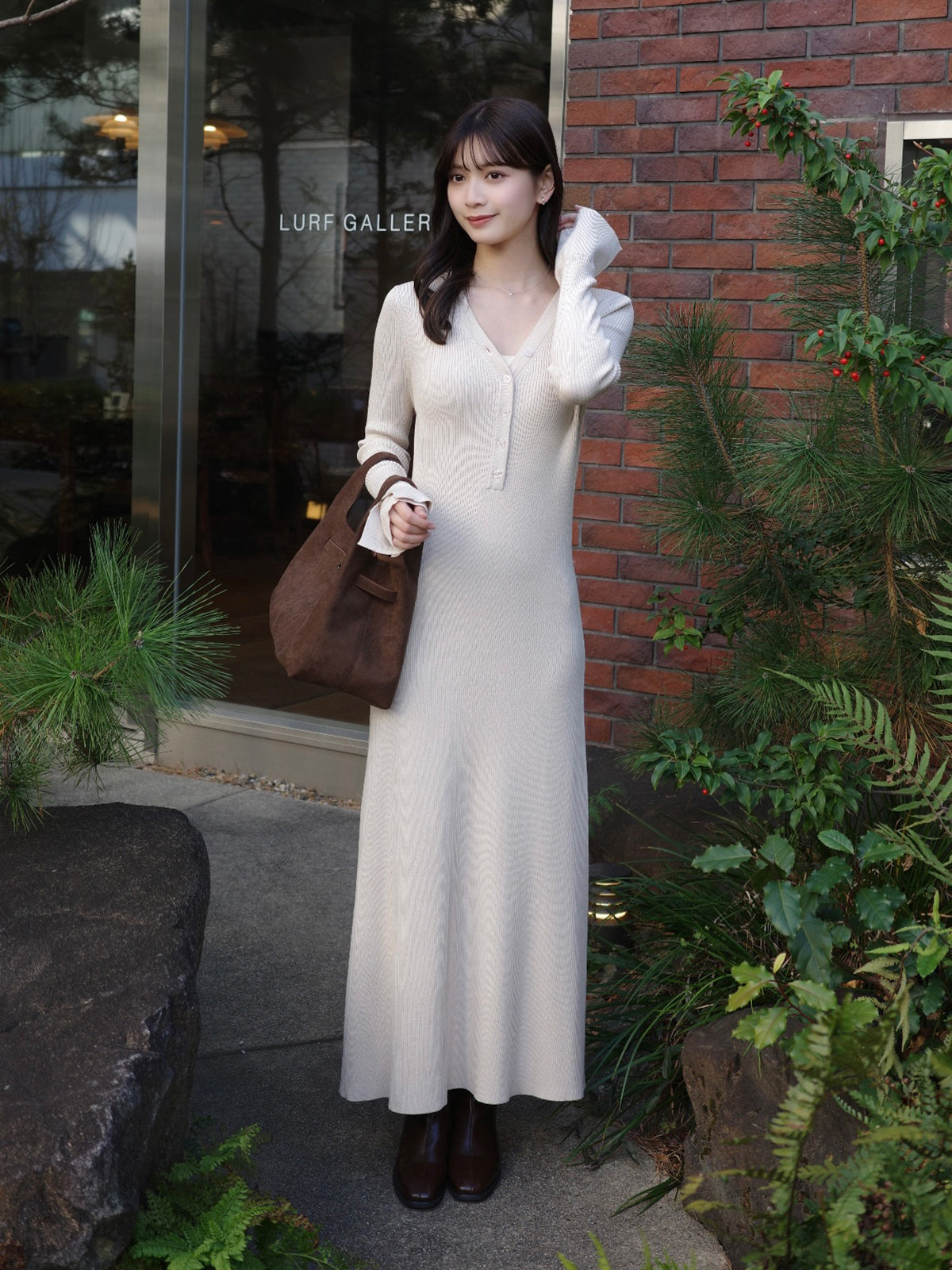 柔らかなリブ編みが体に優しくフィットするニットワンピース。