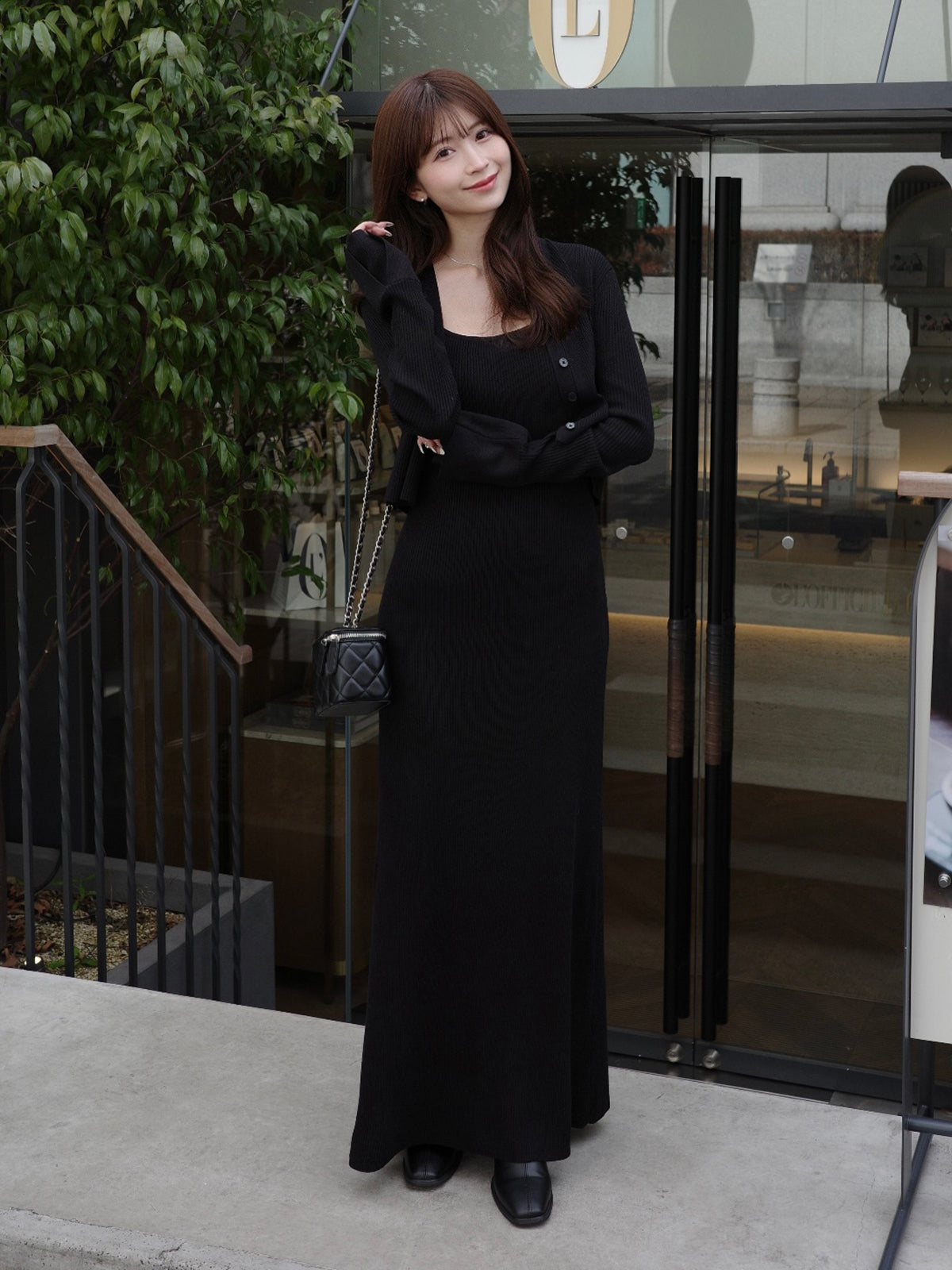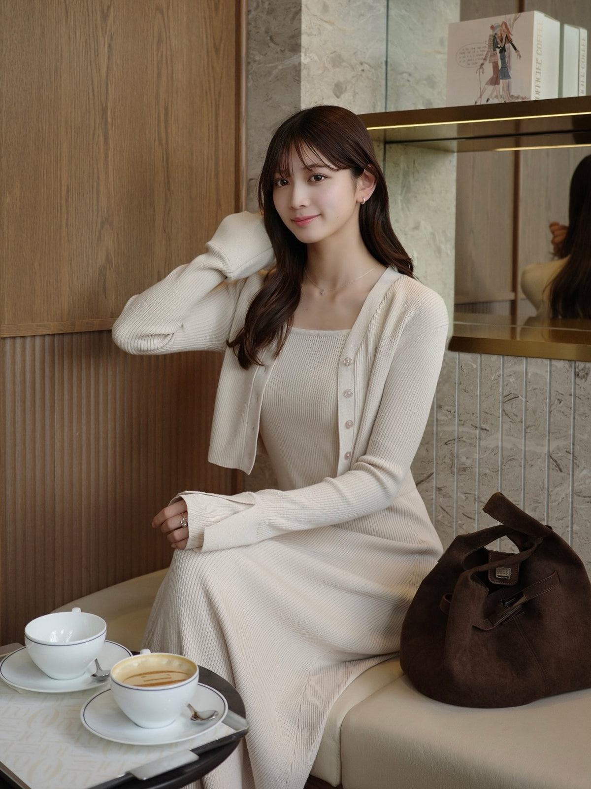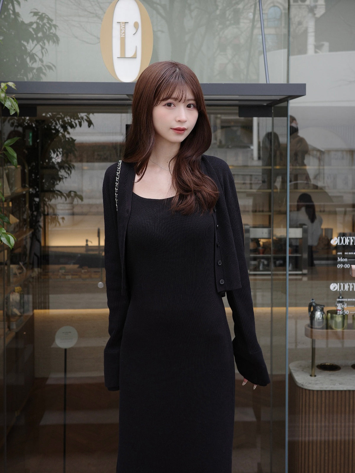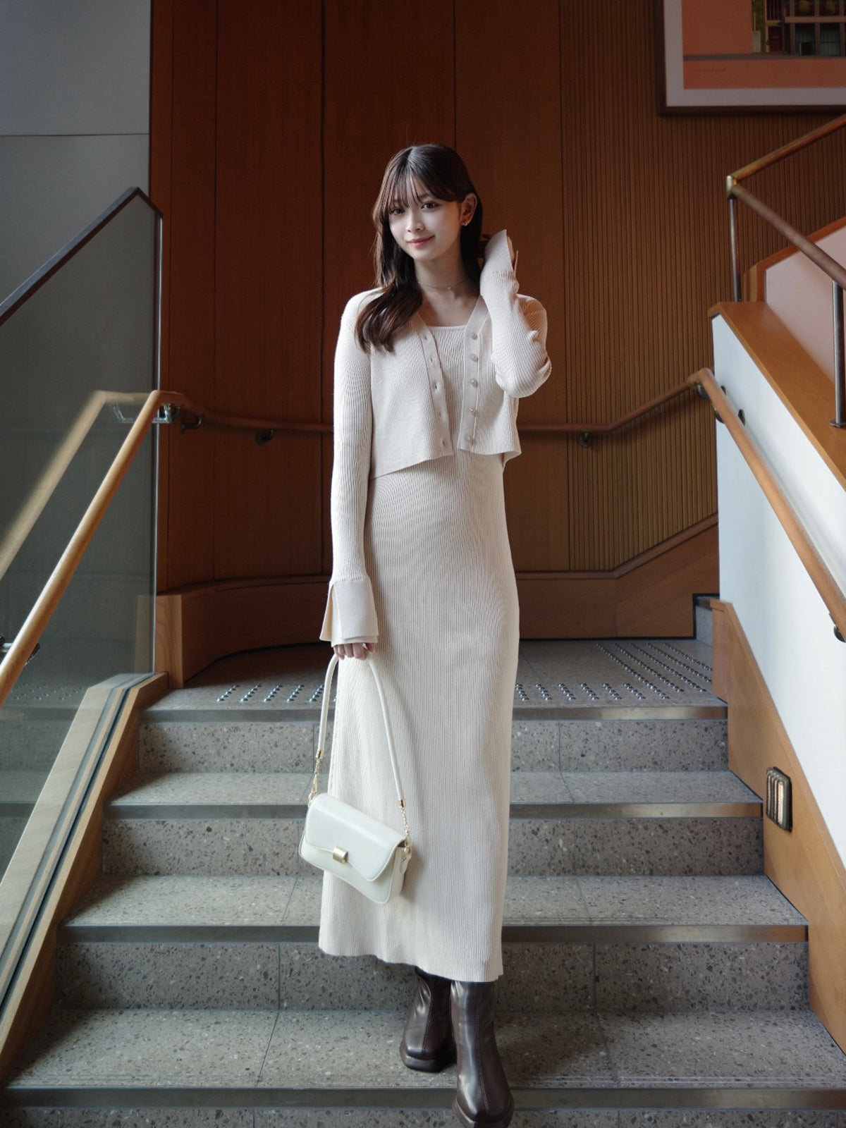 大人気のフロントボタンフレアニットワンピースをベースに、同素材・同カラーでキャミワンピースとカーディガンのセットアイテムが登場。