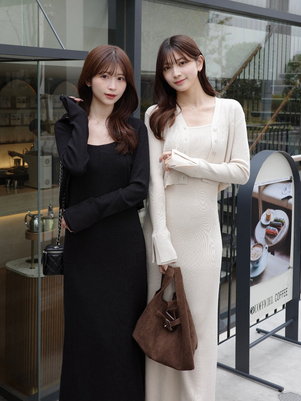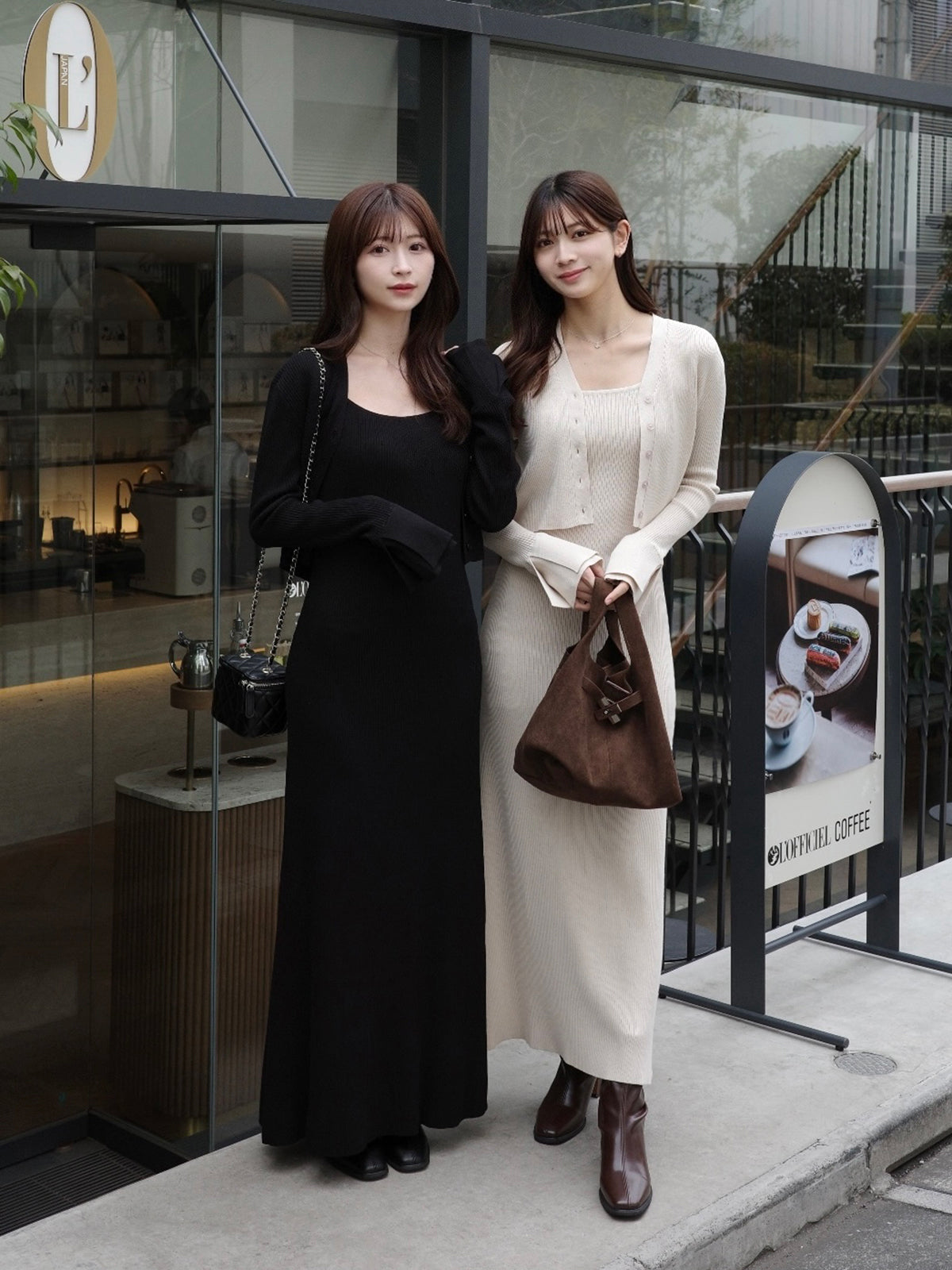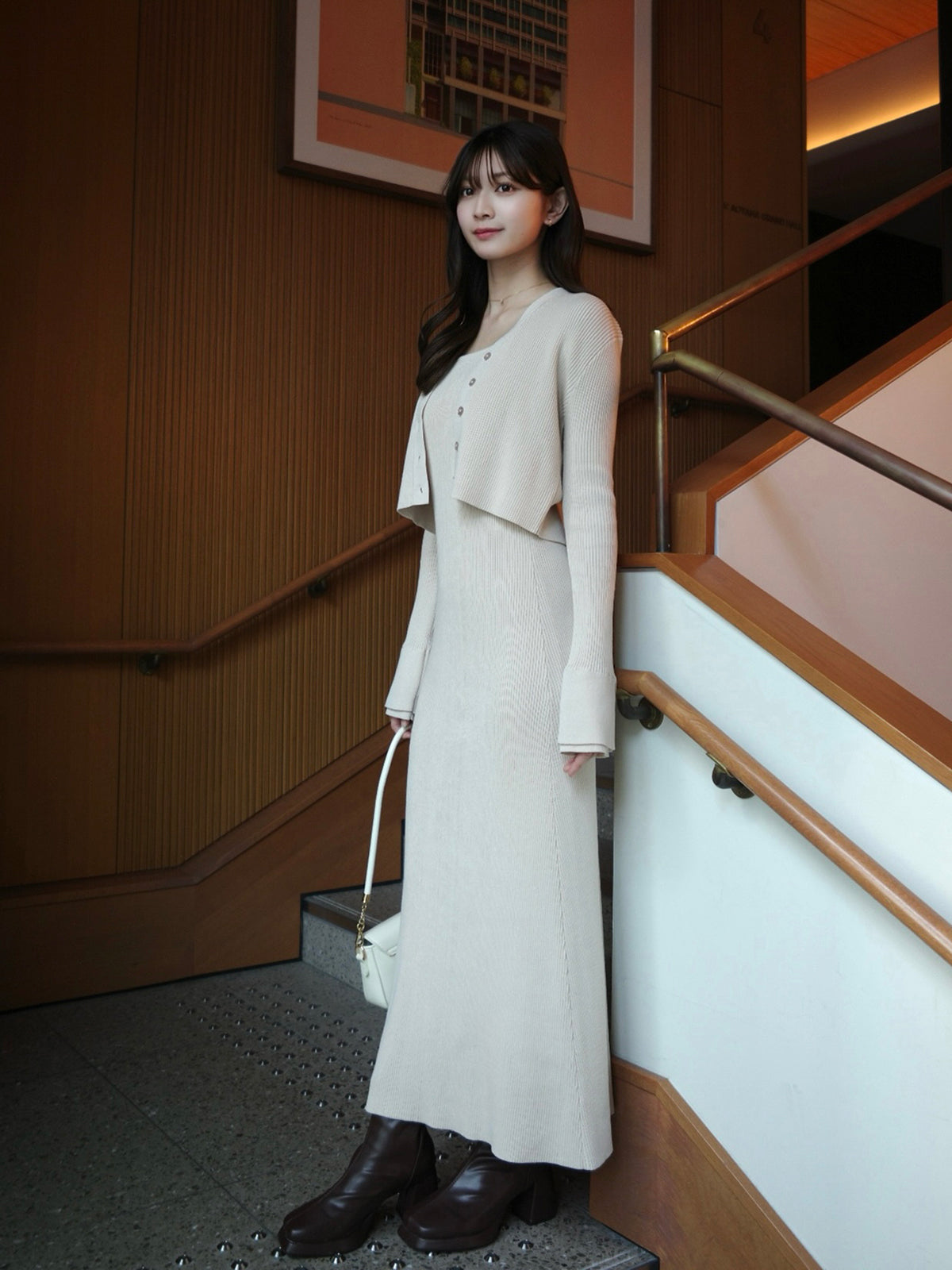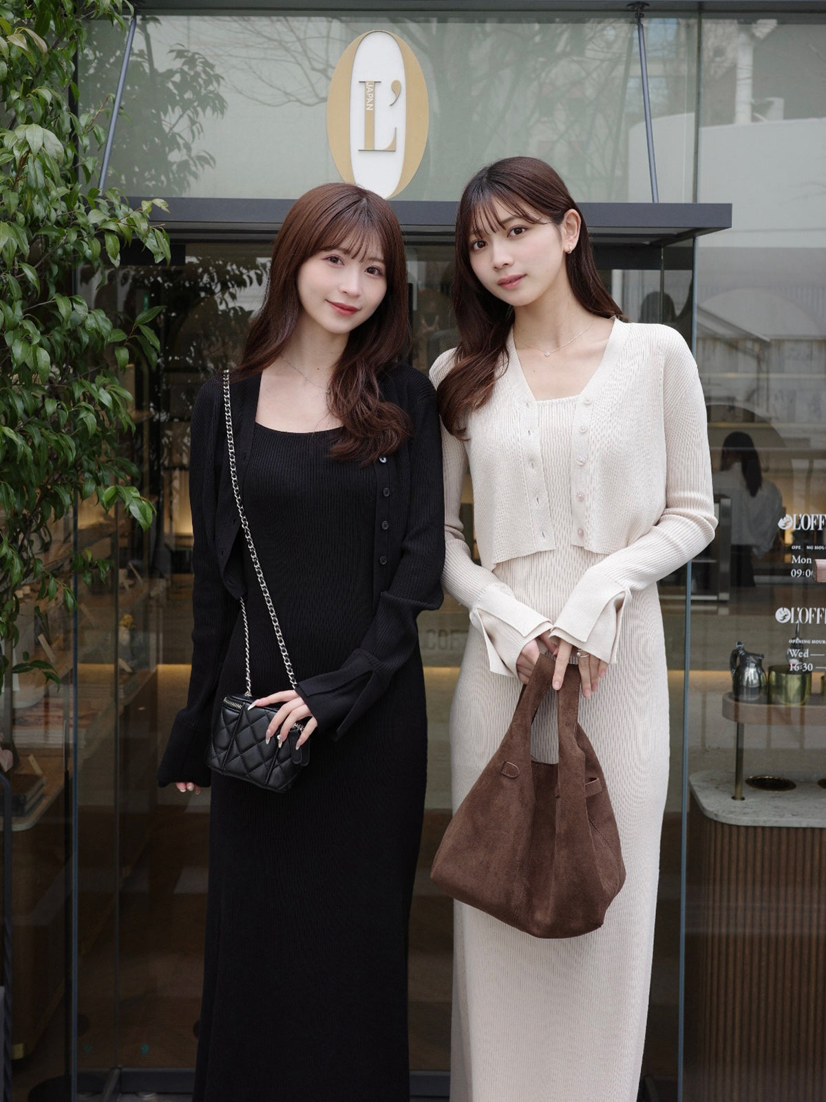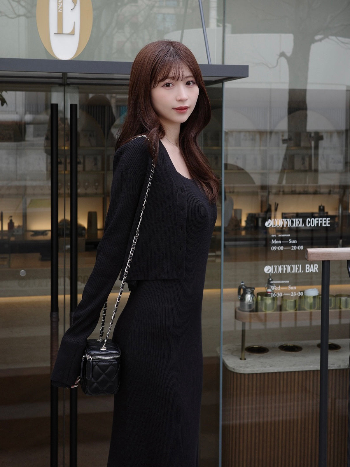 大人気のフロントボタンフレアニットワンピースをベースに、同素材・同カラーでキャミワンピースとカーディガンのセットアイテムが登場。