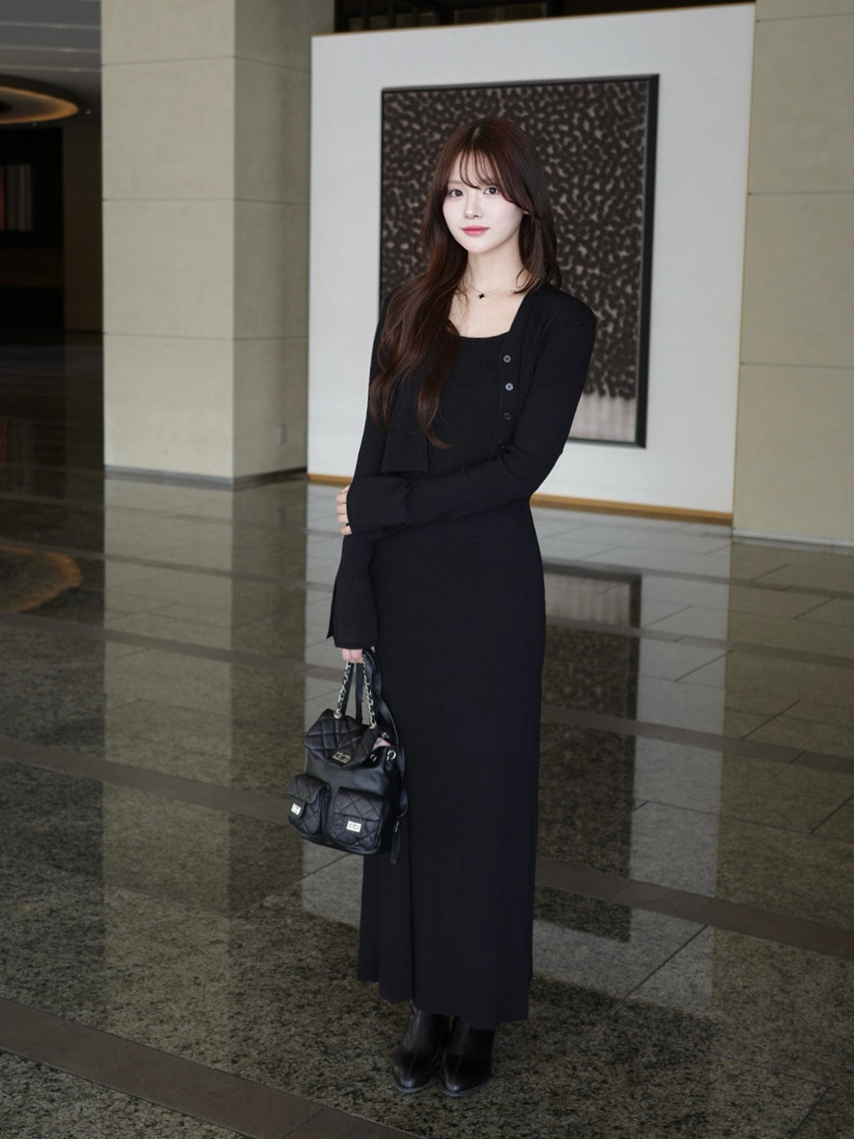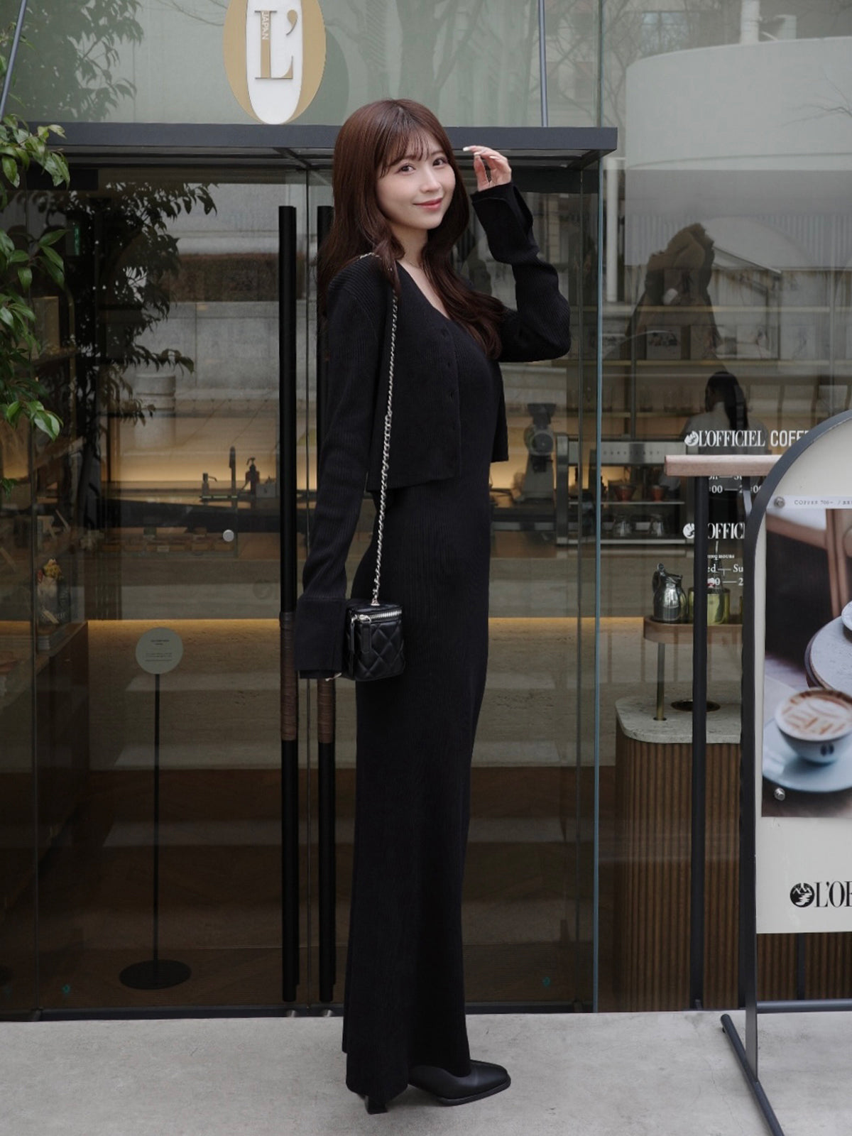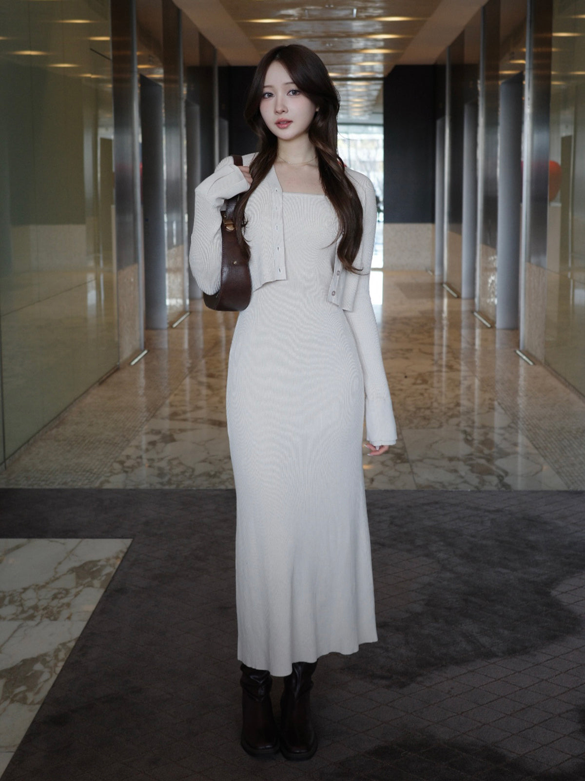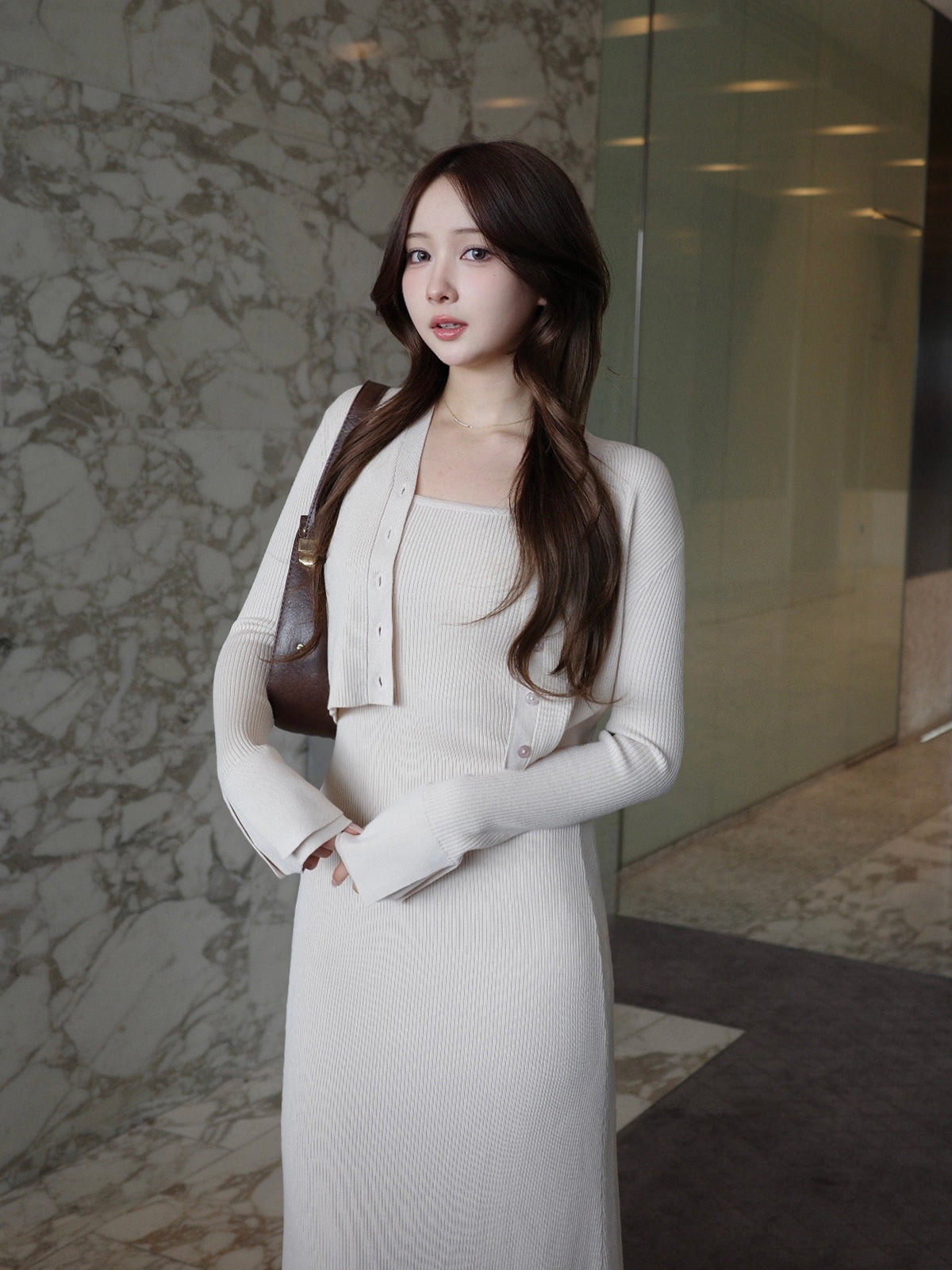大人気のフロントボタンフレアニットワンピースをベースに、同素材・同カラーでキャミワンピースとカーディガンのセットアイテムが登場。