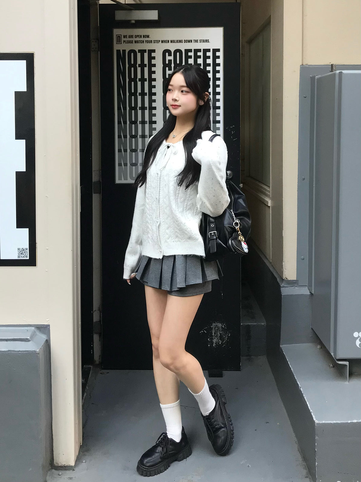 フロントにリボンを配し、あしらったパールボタンがポイントに。