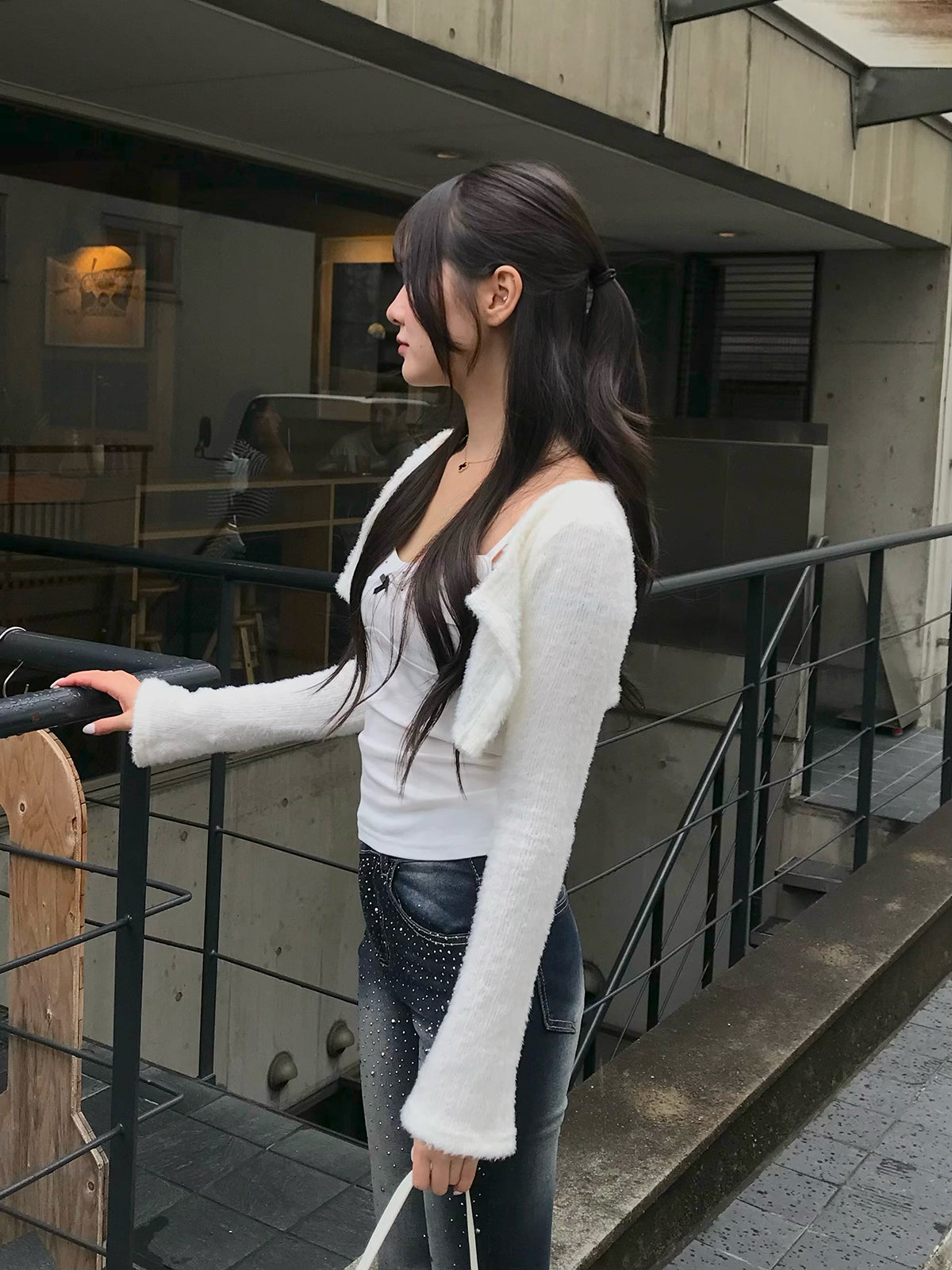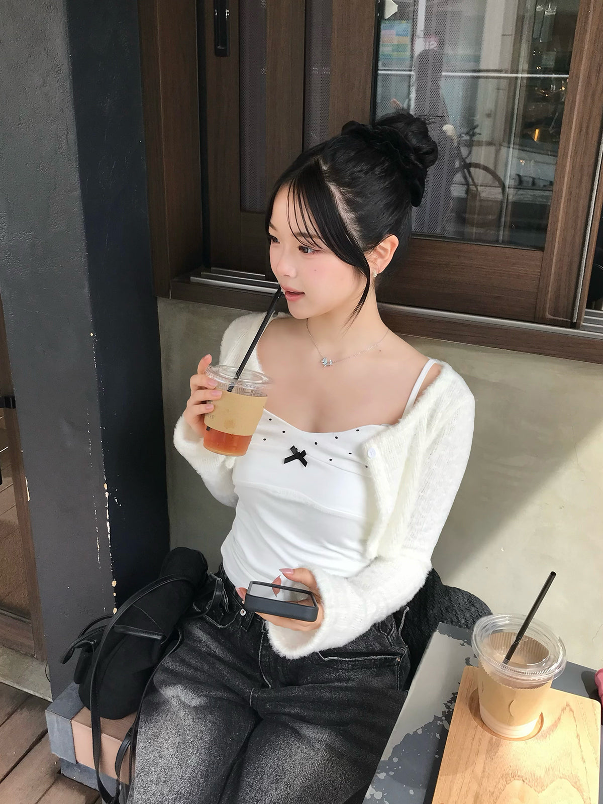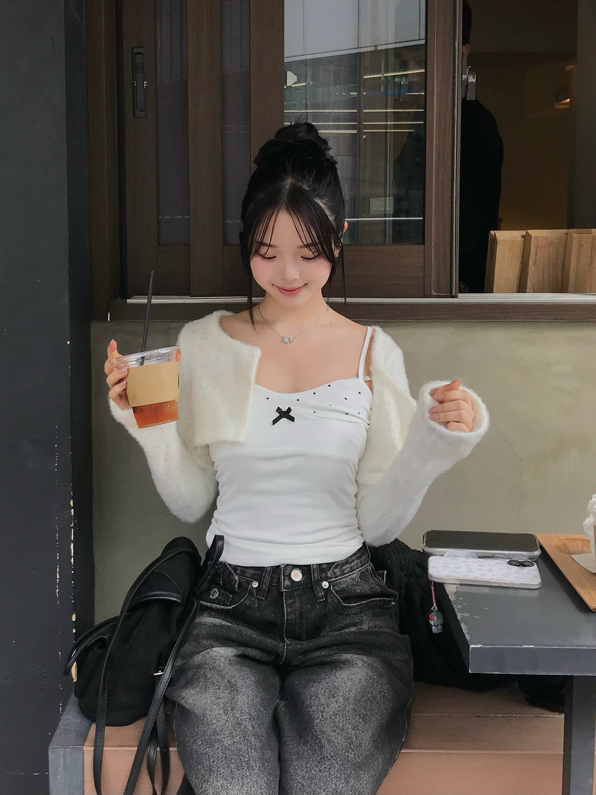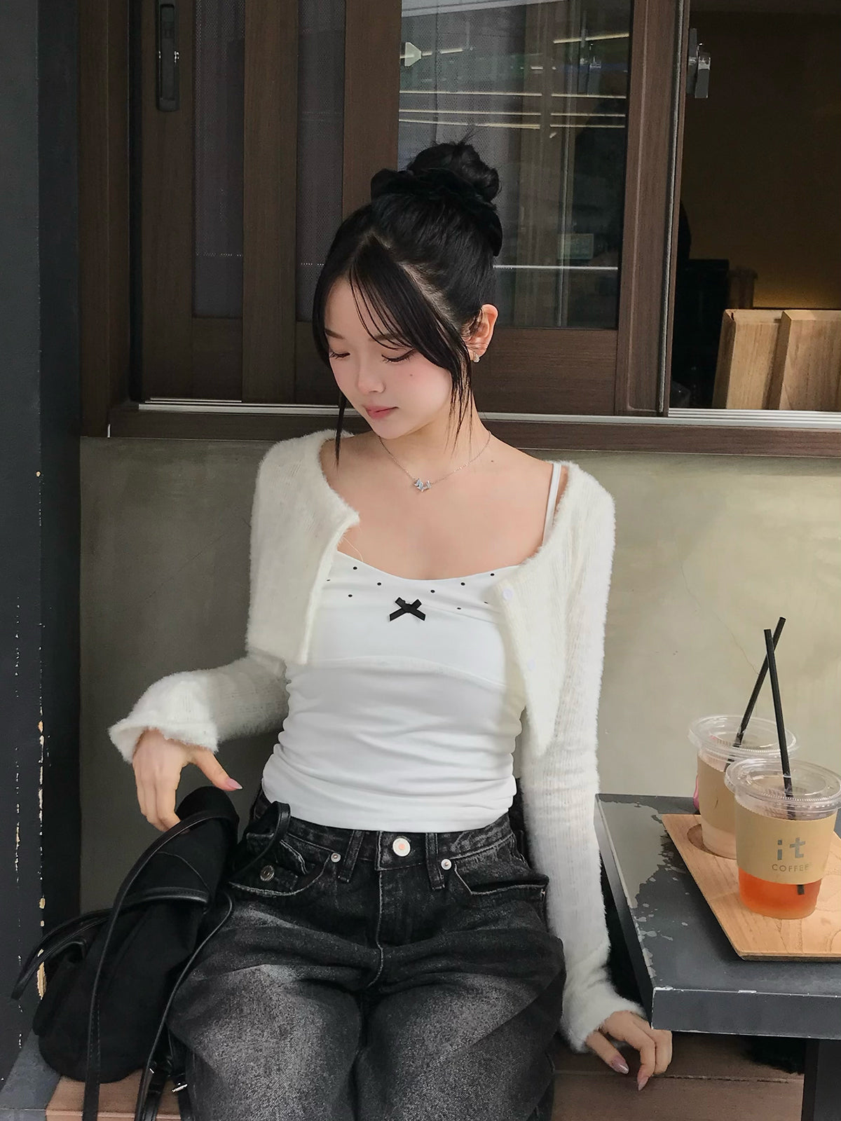 シャギー素材のショート丈カーディガンとドット柄のキャミソールがセットになったアイテム。