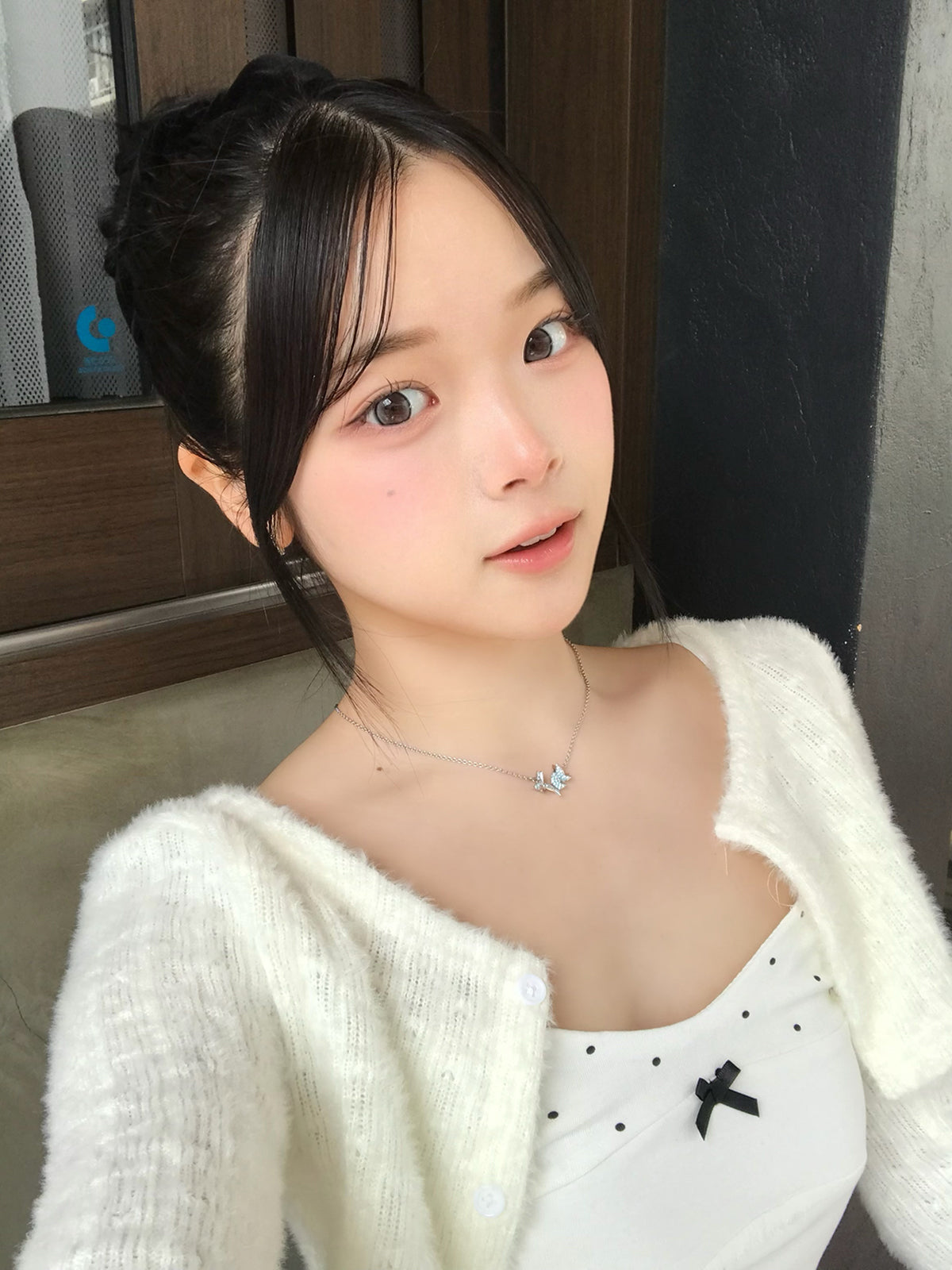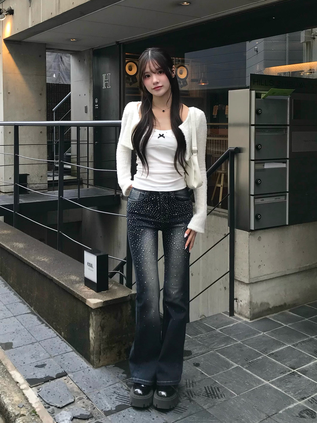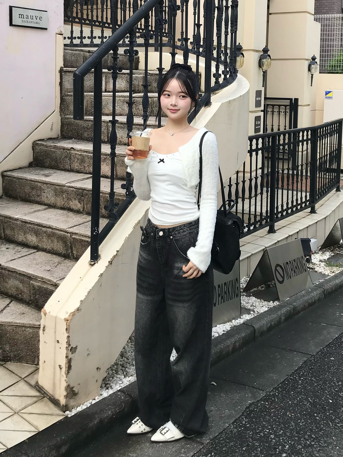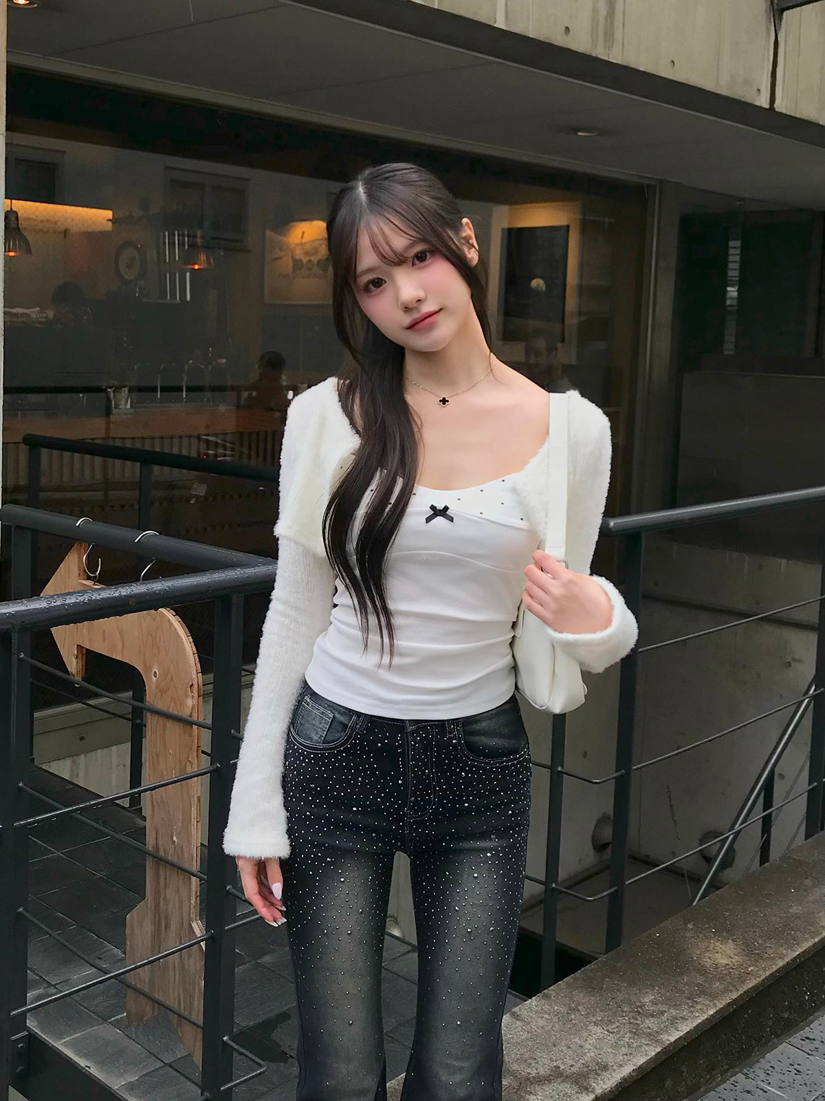 シャギー素材のショート丈カーディガンとドット柄のキャミソールがセットになったアイテム。