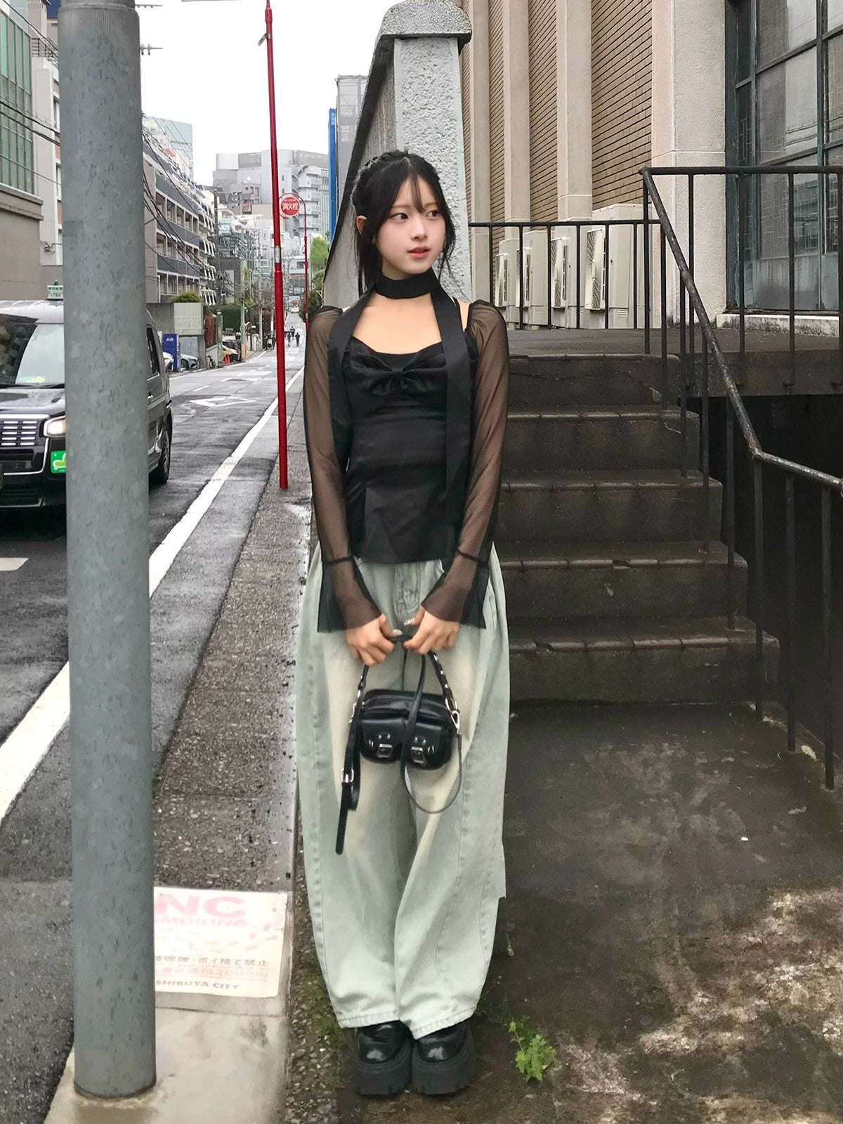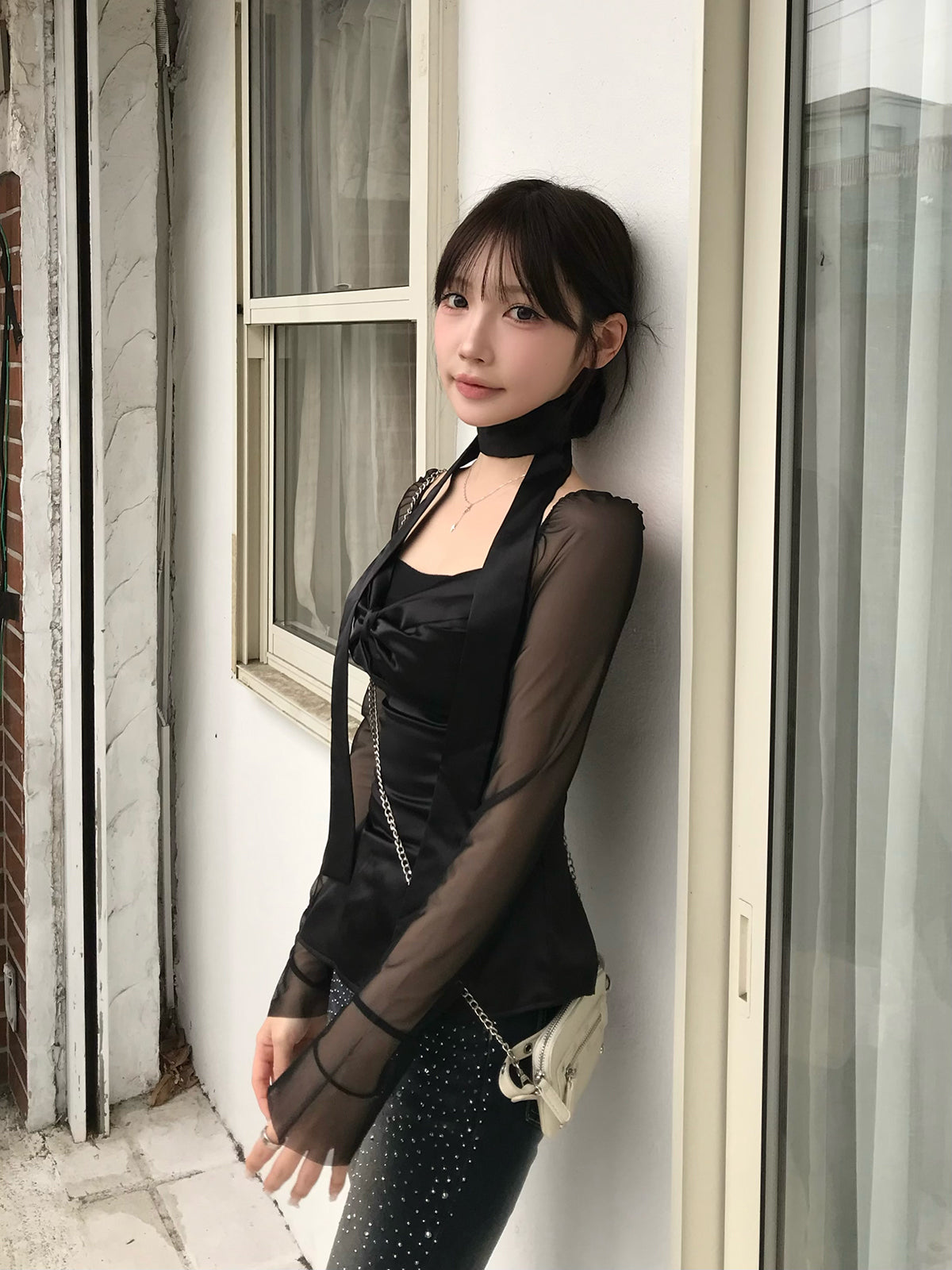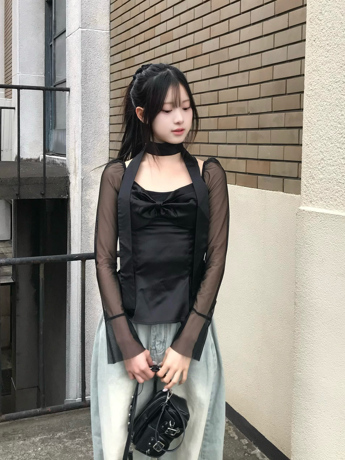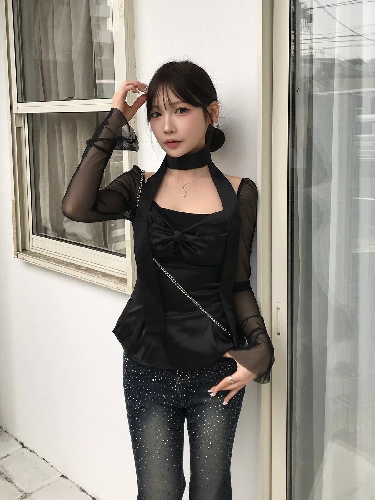 サテンの光沢感とシアースリーブのコントラストが印象的なブラウス。