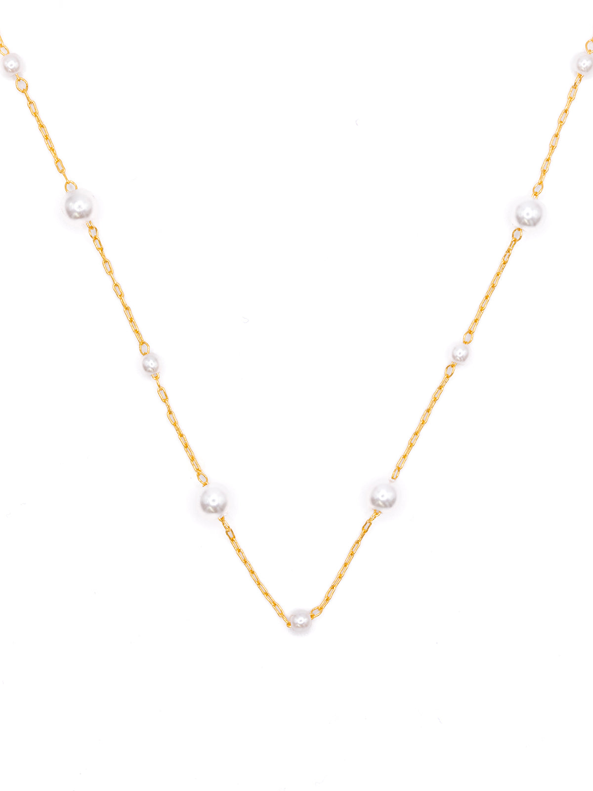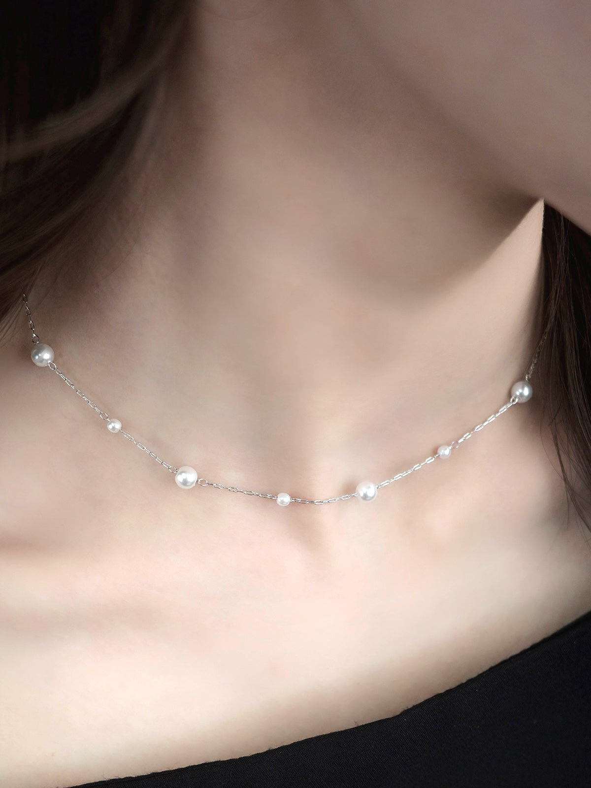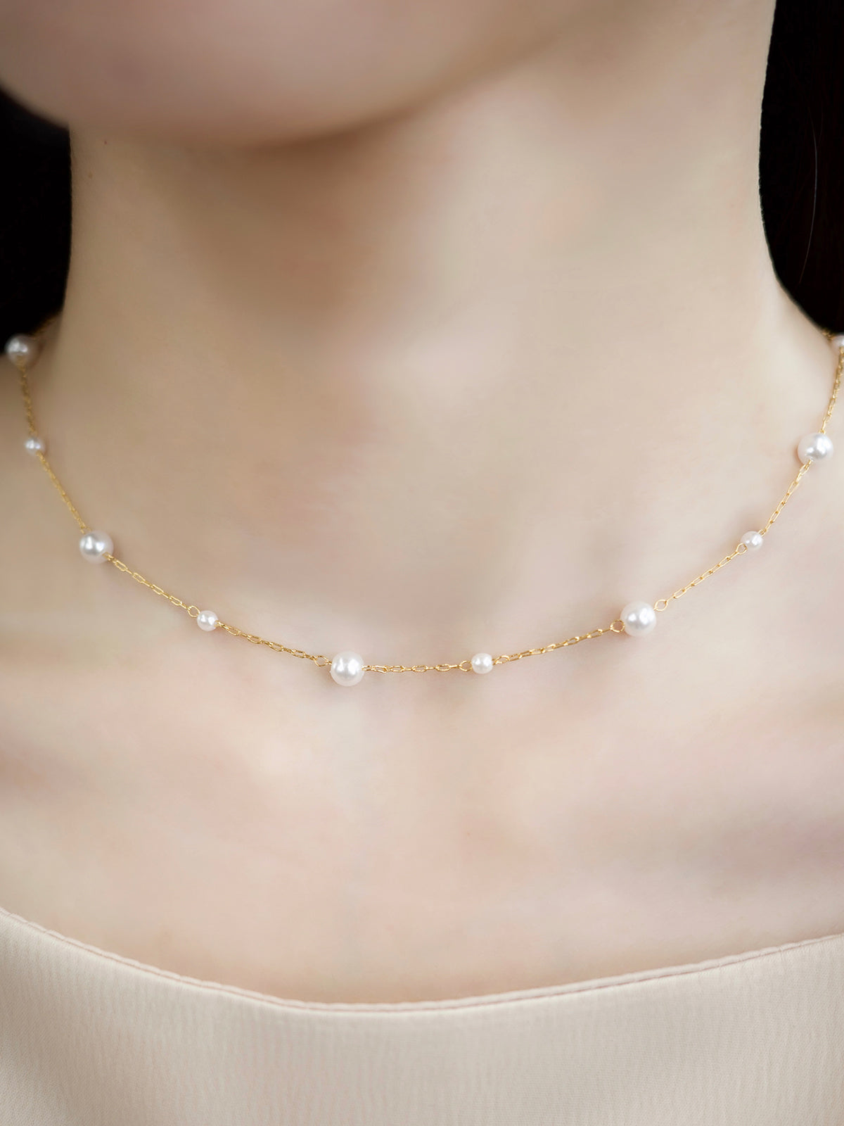 サイズ違いのパールが均等に並んだデザインのネックレス。