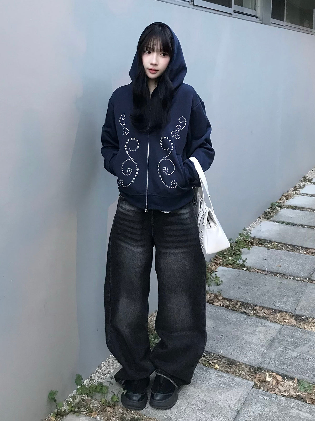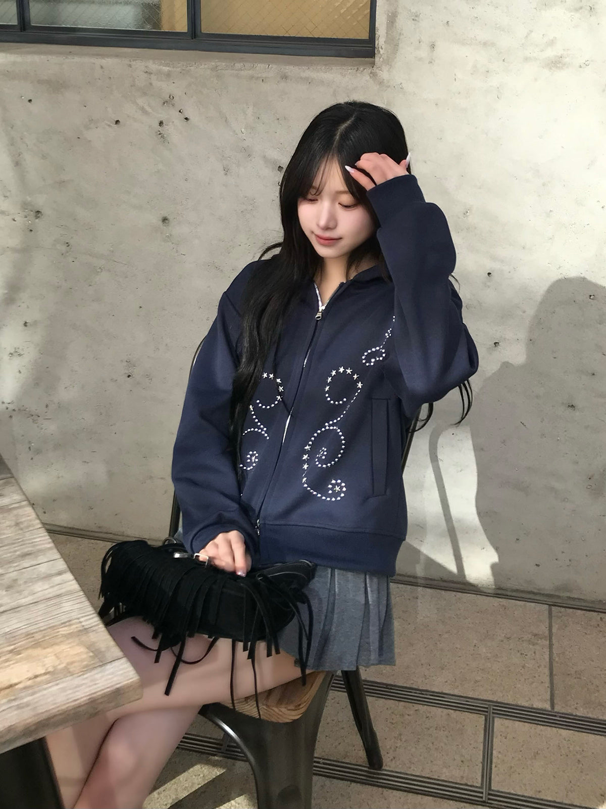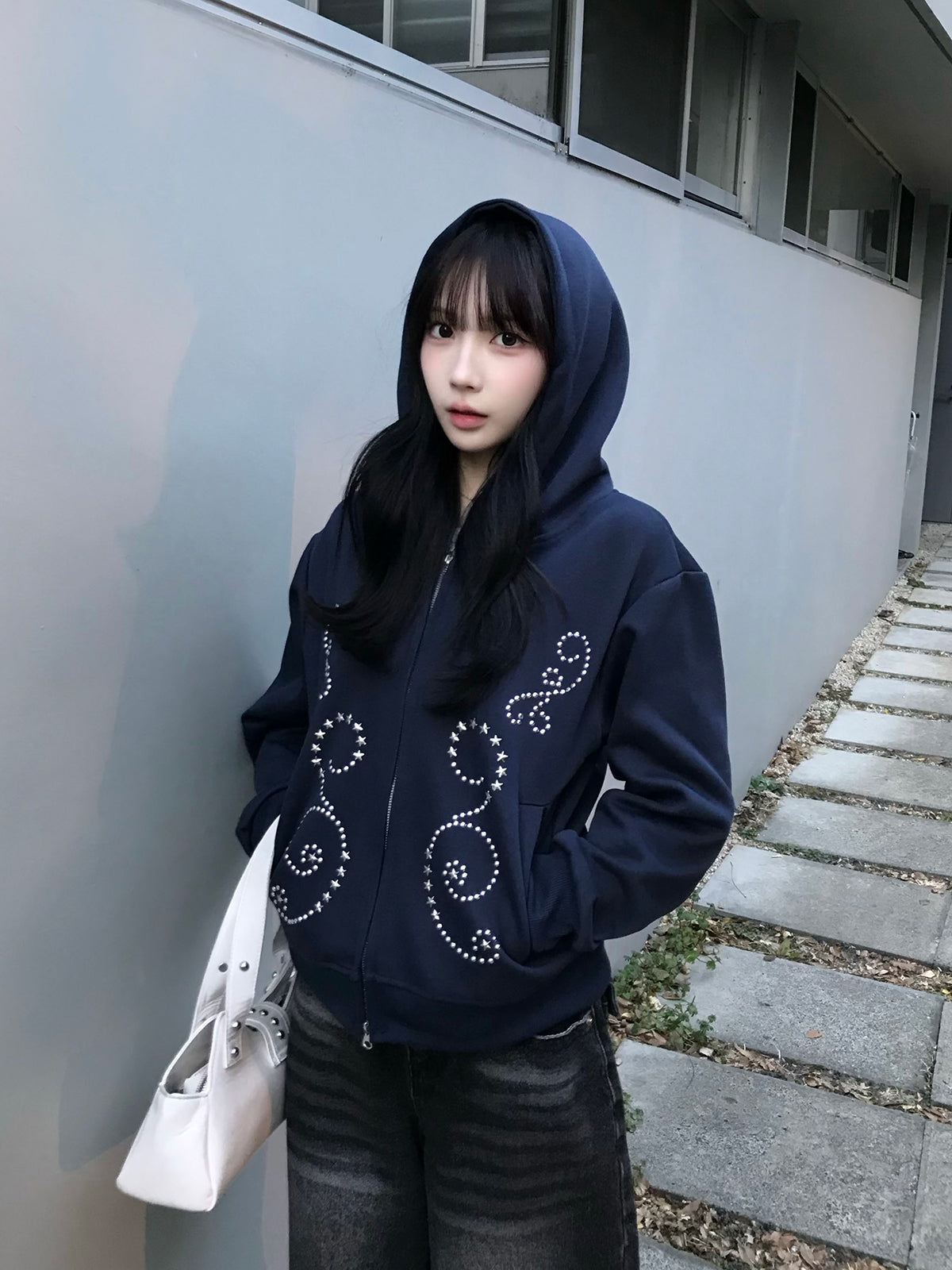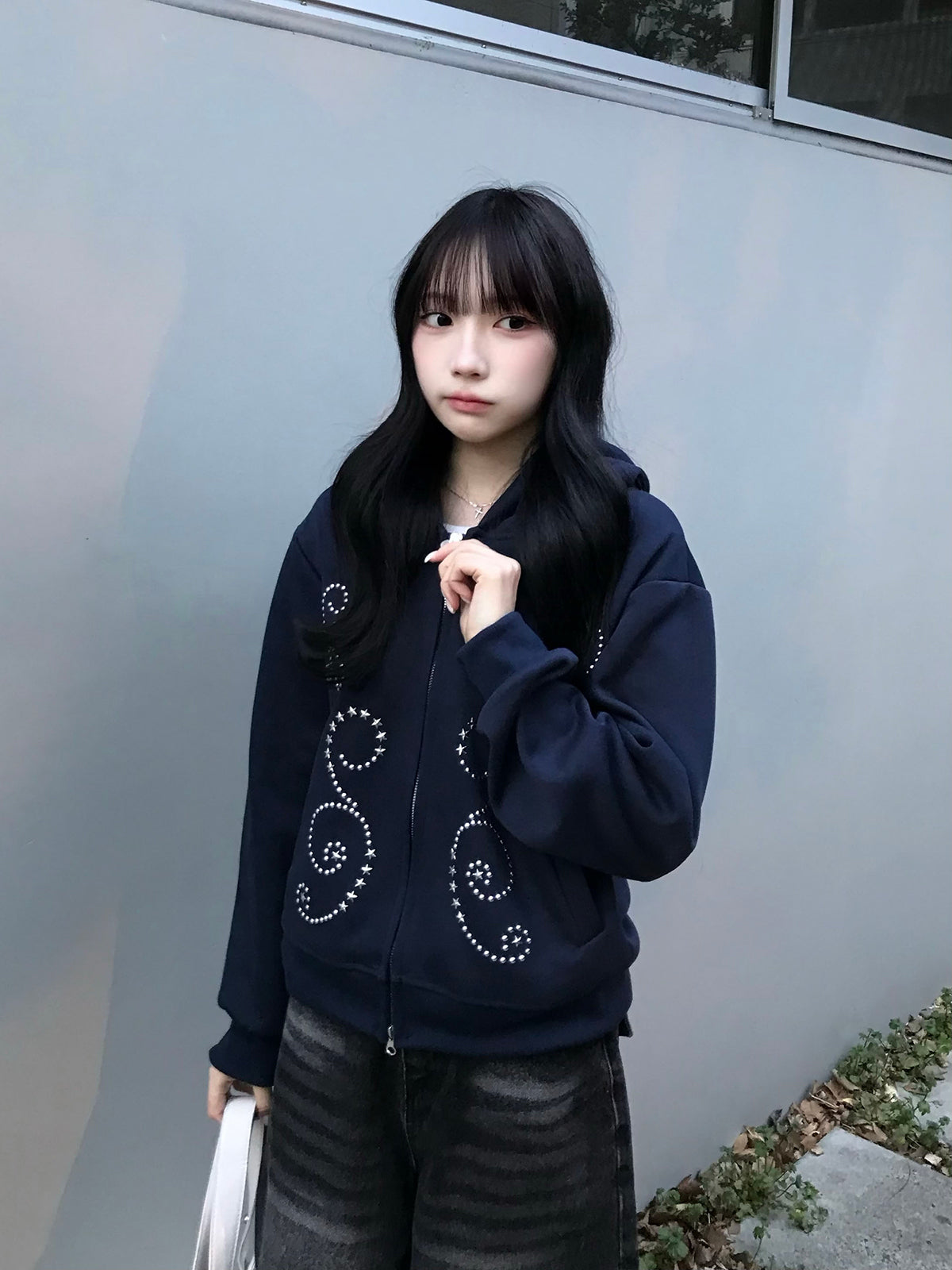 スターとサークルモチーフのスタッズをあしらった、存在感のあるダブルジップパーカー。