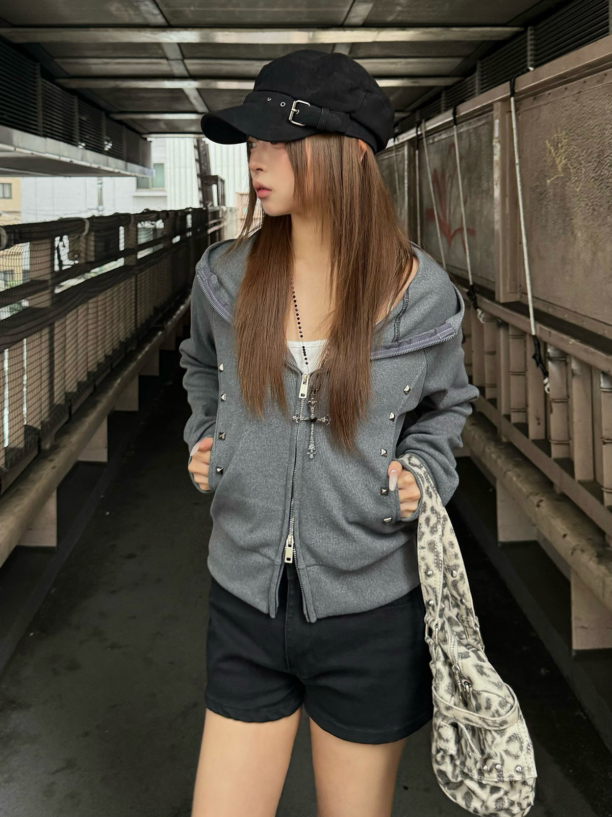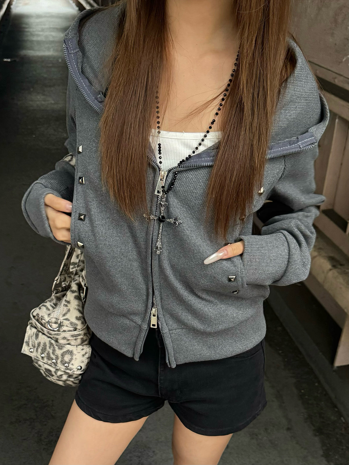 スタッズダブルジップリブパーカー