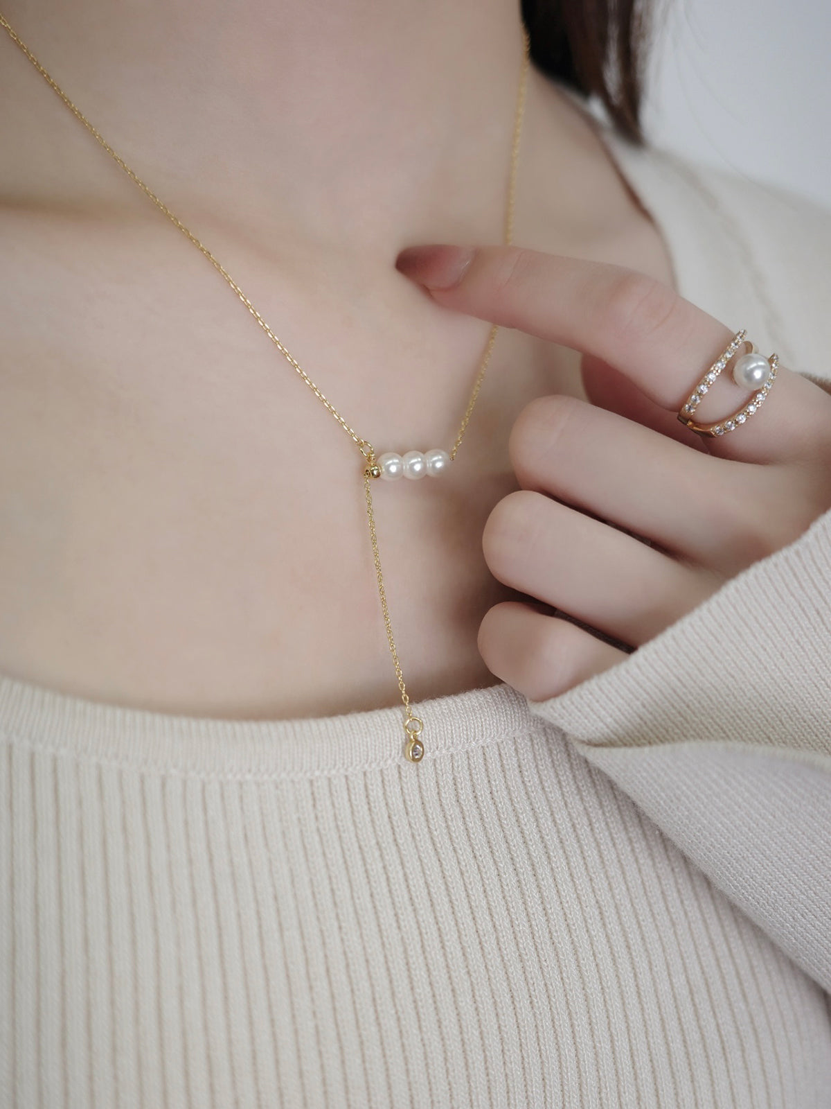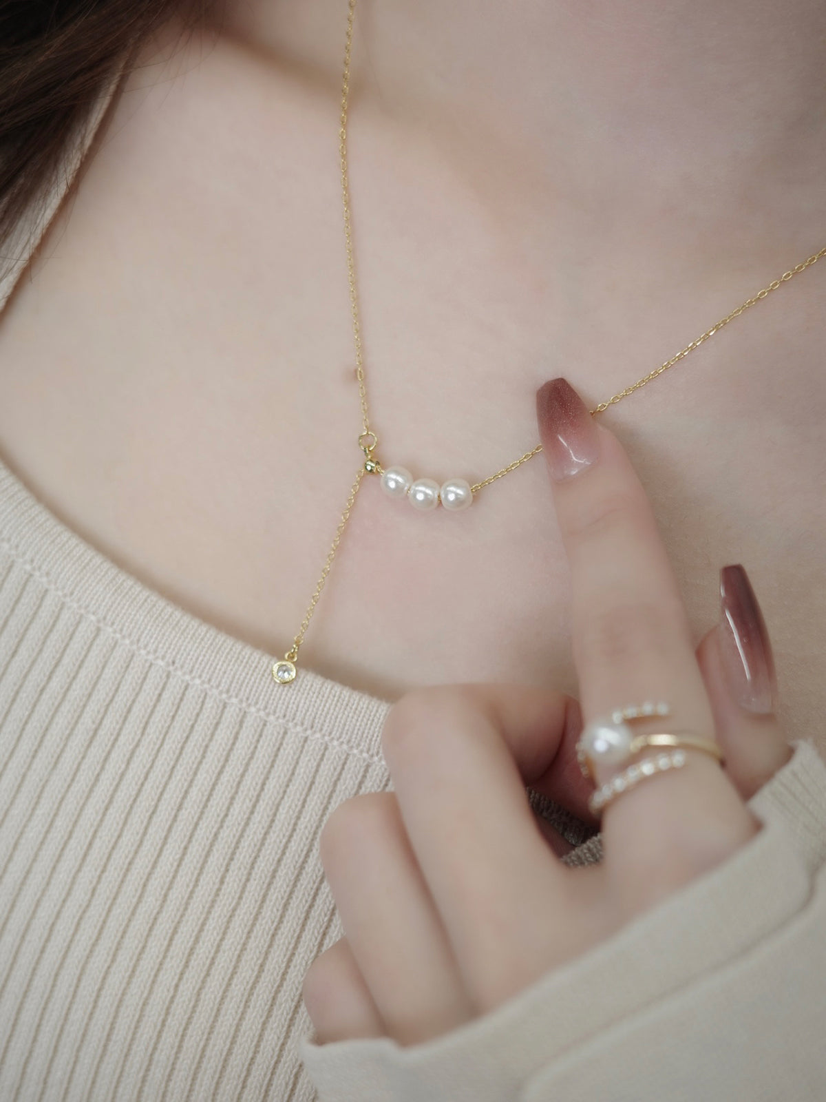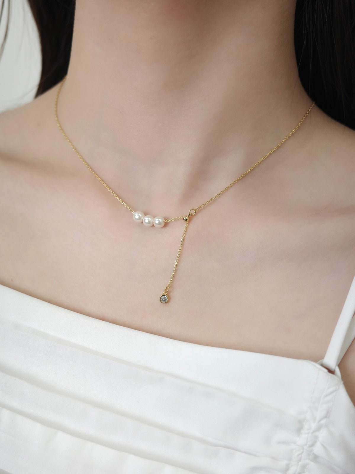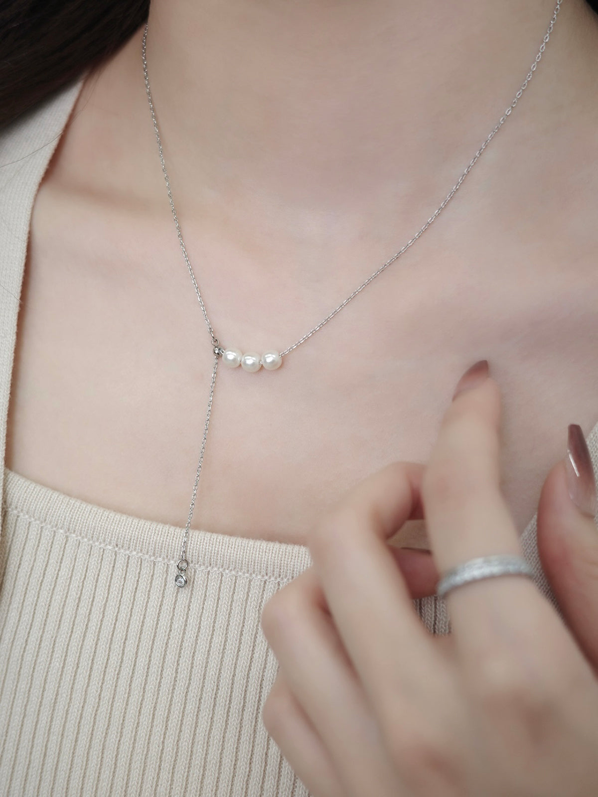 艶めく3粒のパールが連なり、さりげないアクセントを添えるネックレス。