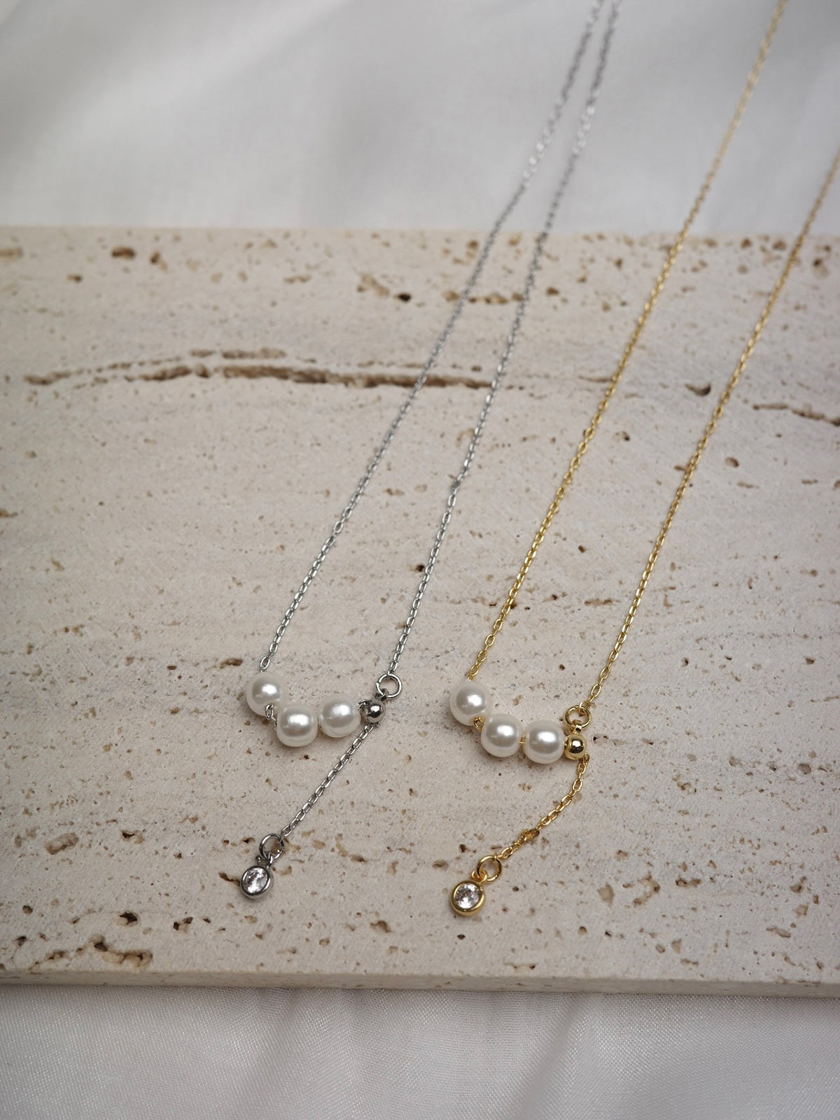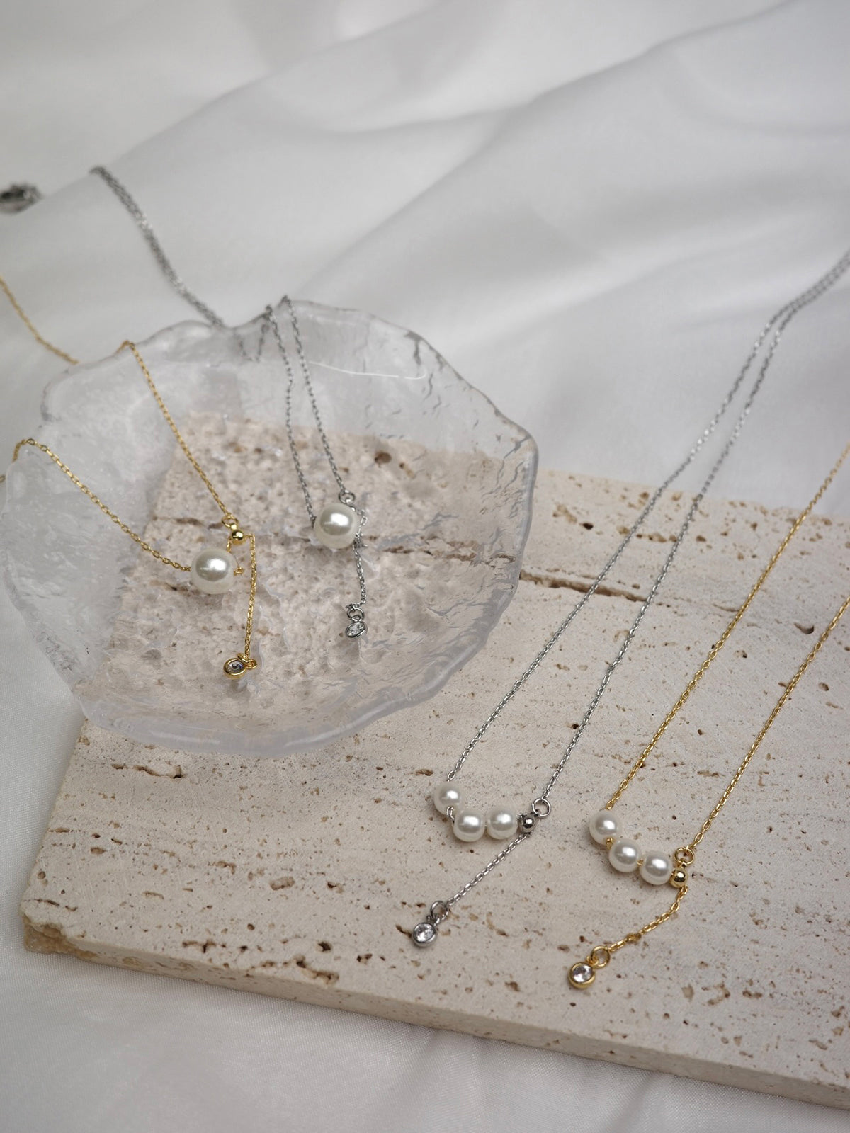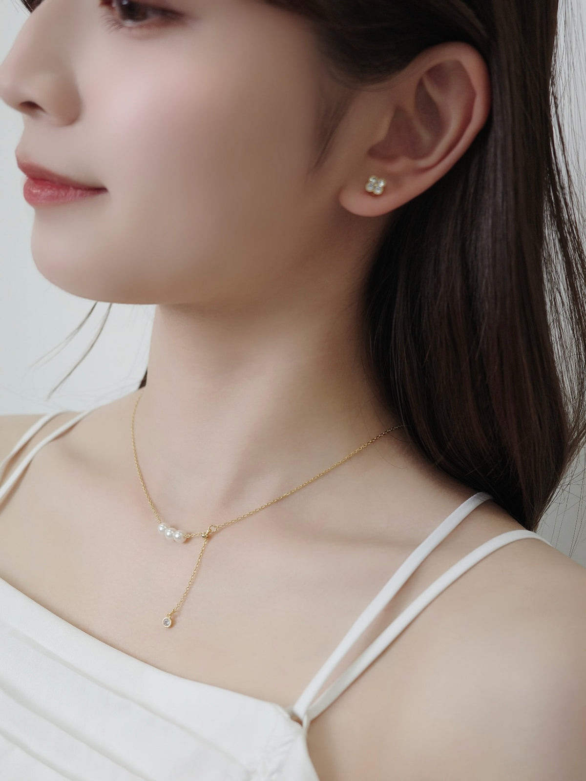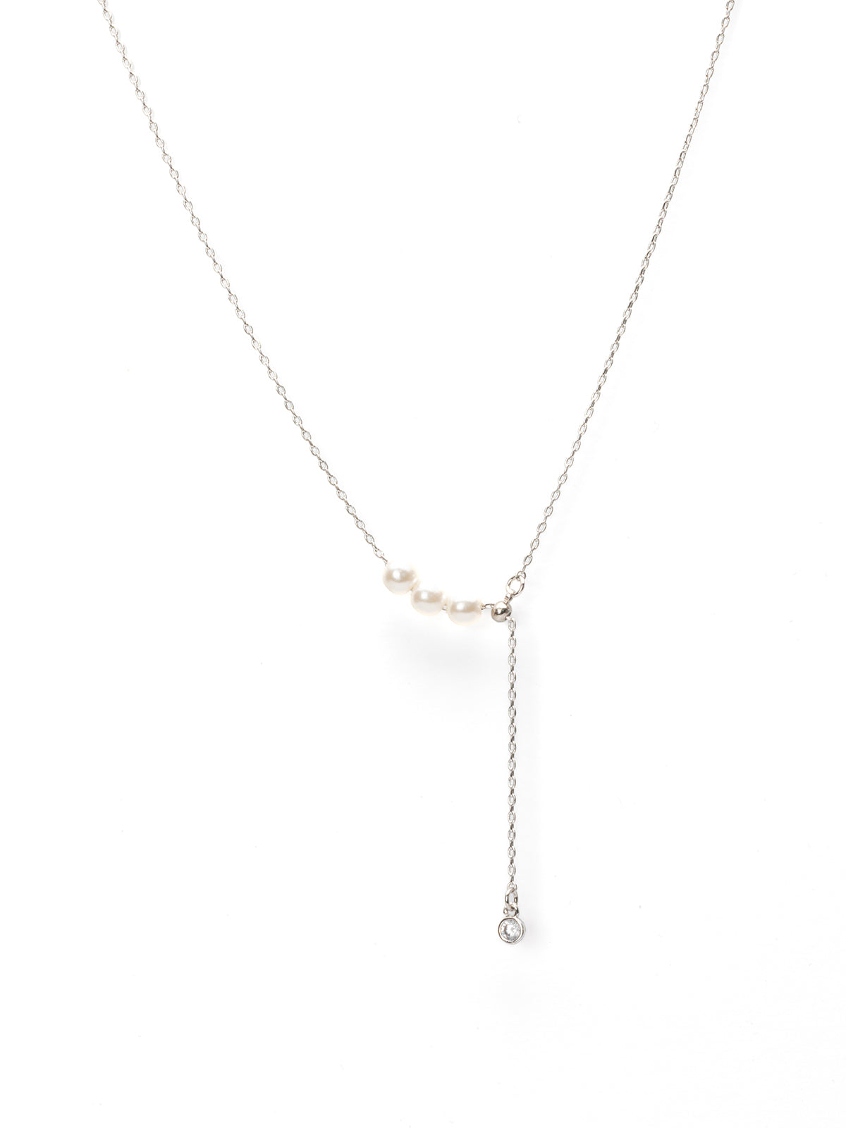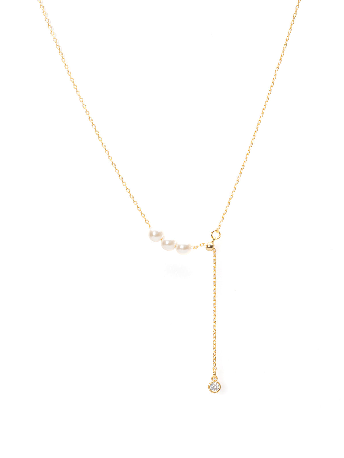 艶めく3粒のパールが連なり、さりげないアクセントを添えるネックレス。