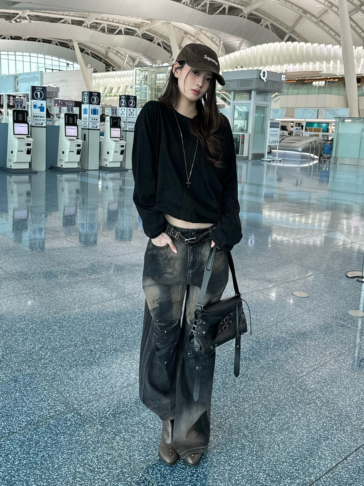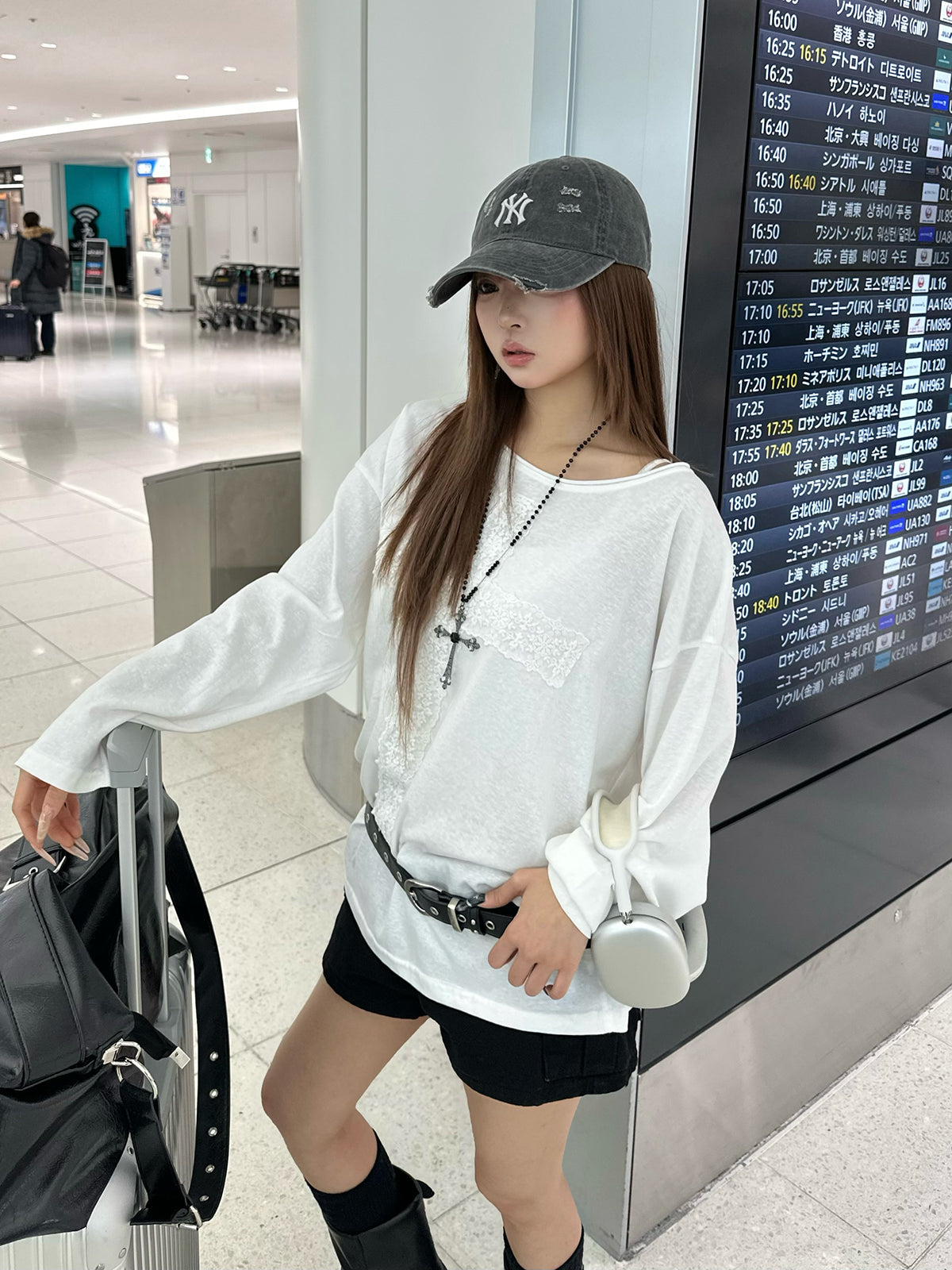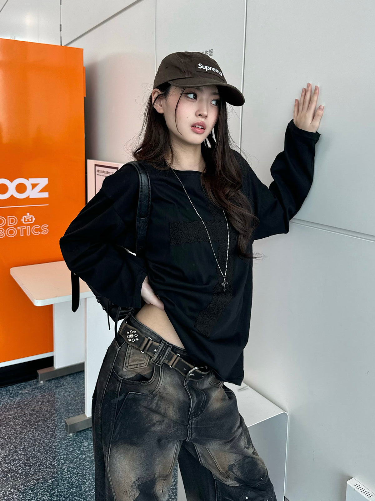 前片采用花朵蕾丝交叉设计,十分吸睛的长袖T恤。