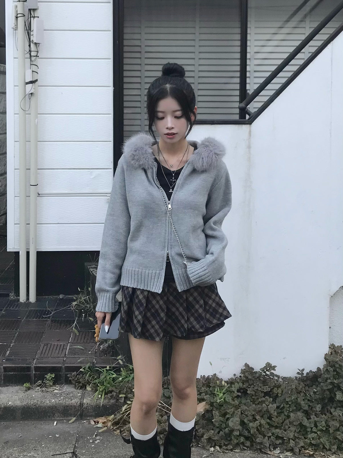 蓬松的仿毛材质是这款连帽针织衫的亮点。