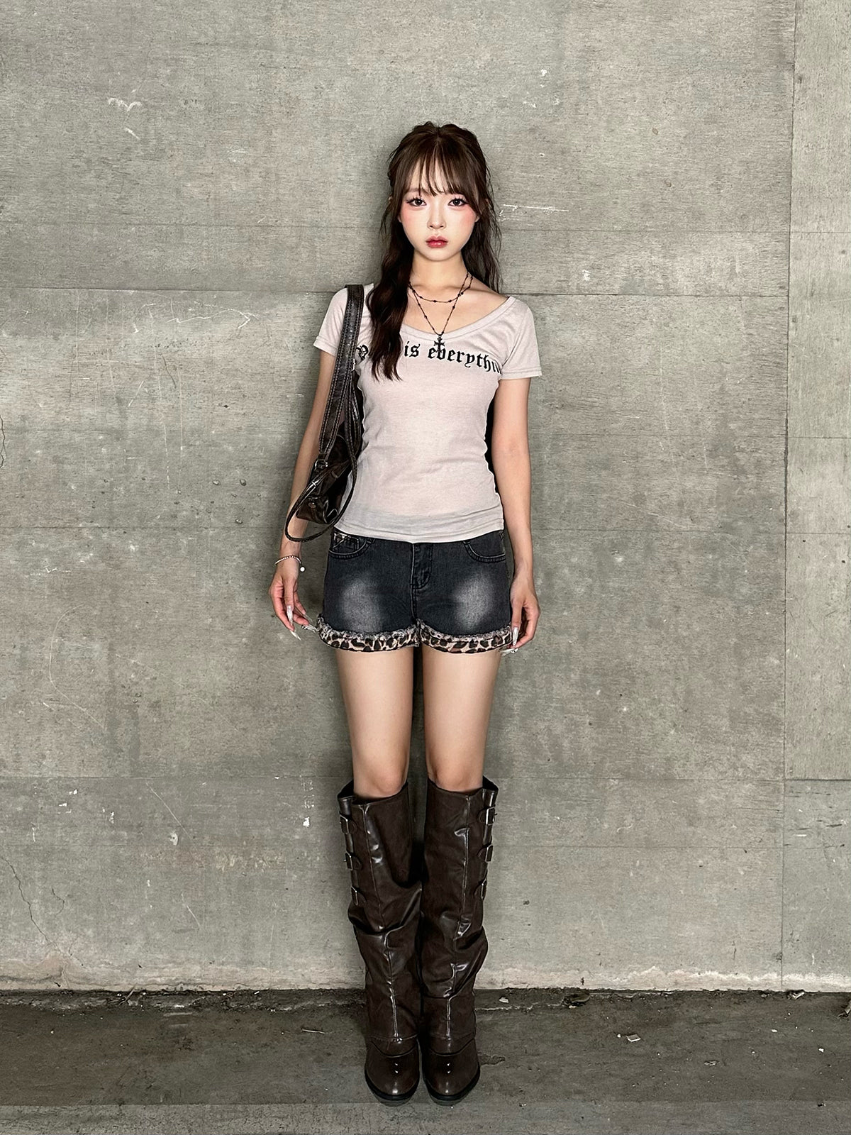 在细窄的翻边上点缀豹纹图案的短款牛仔裤。