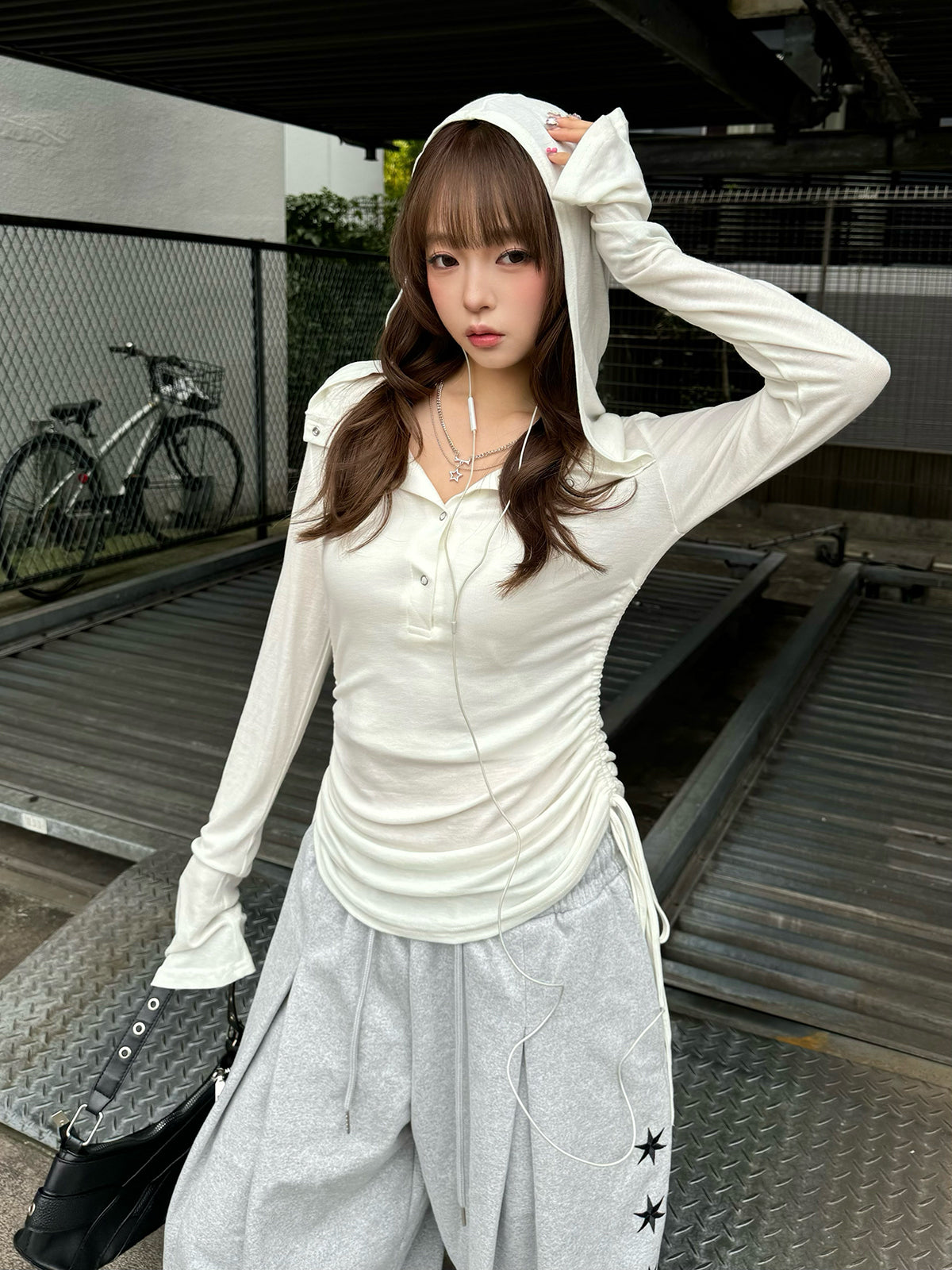 フード付きのデザインに、サイドのドローストリングがアクセント。