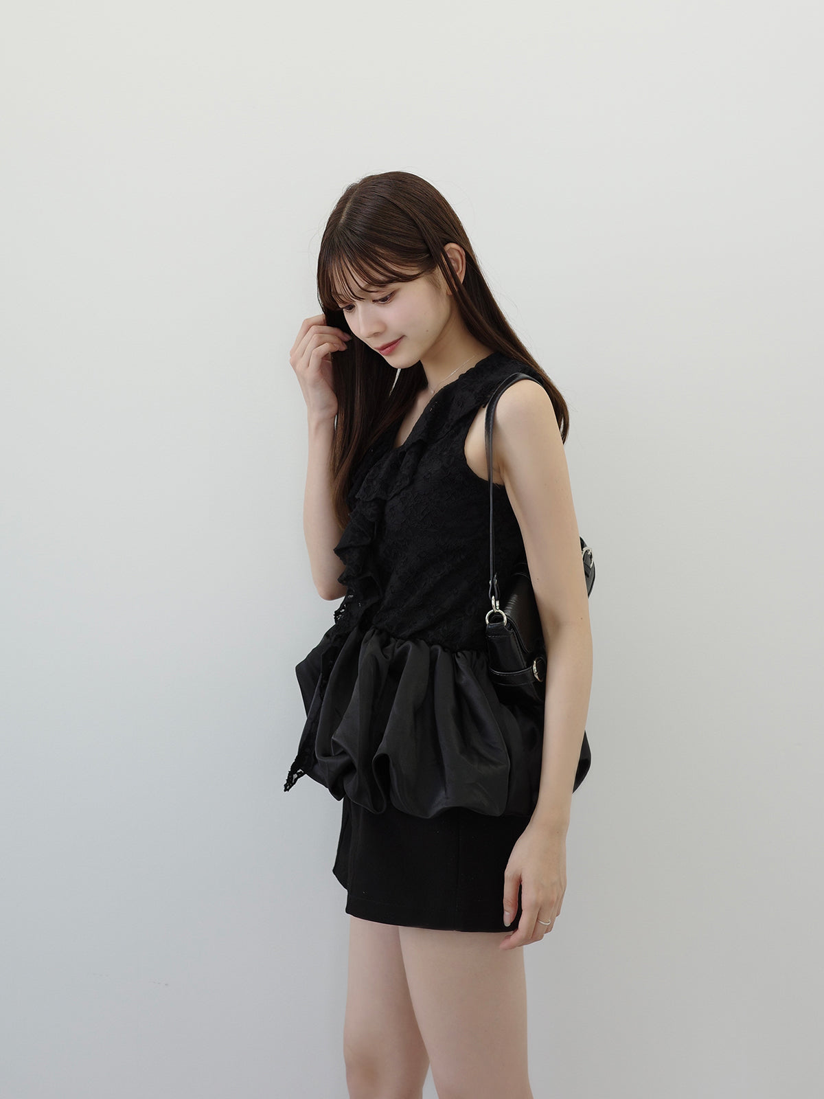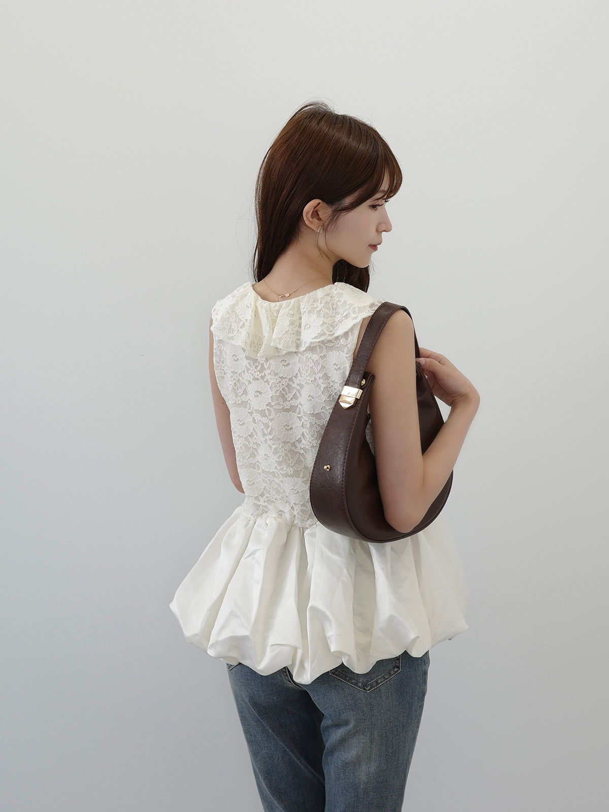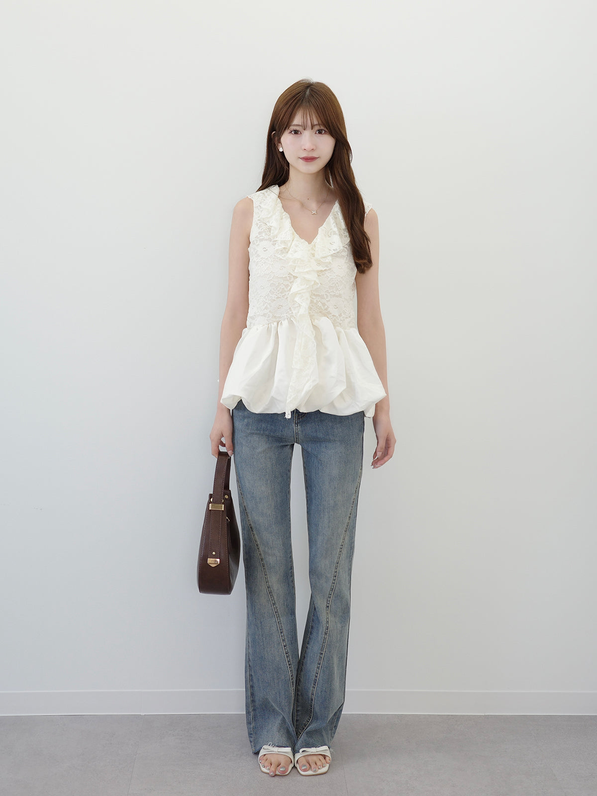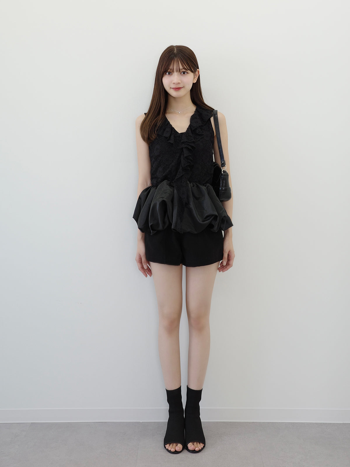 繊細なフラワーレースと、ふんわり広がるバルーンシルエットの裾が目を惹く上品なブラウス。