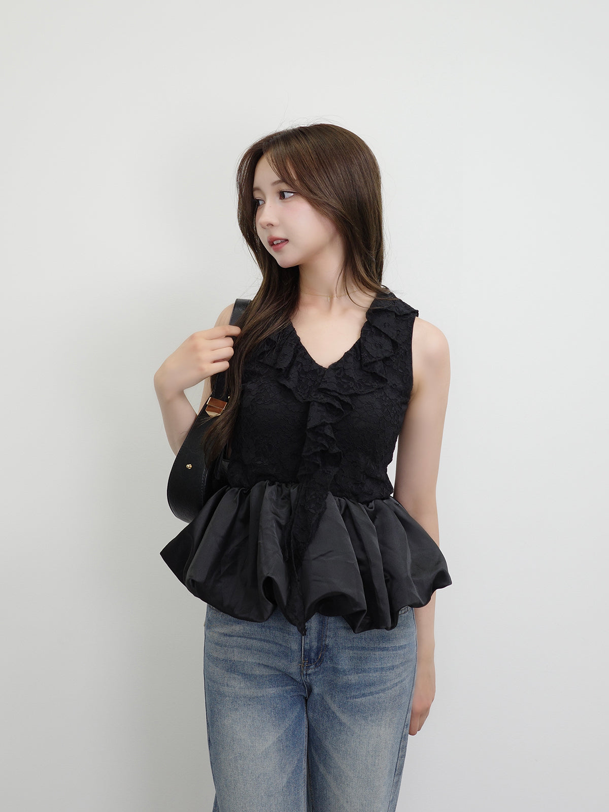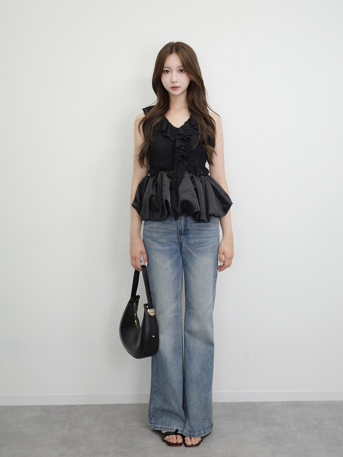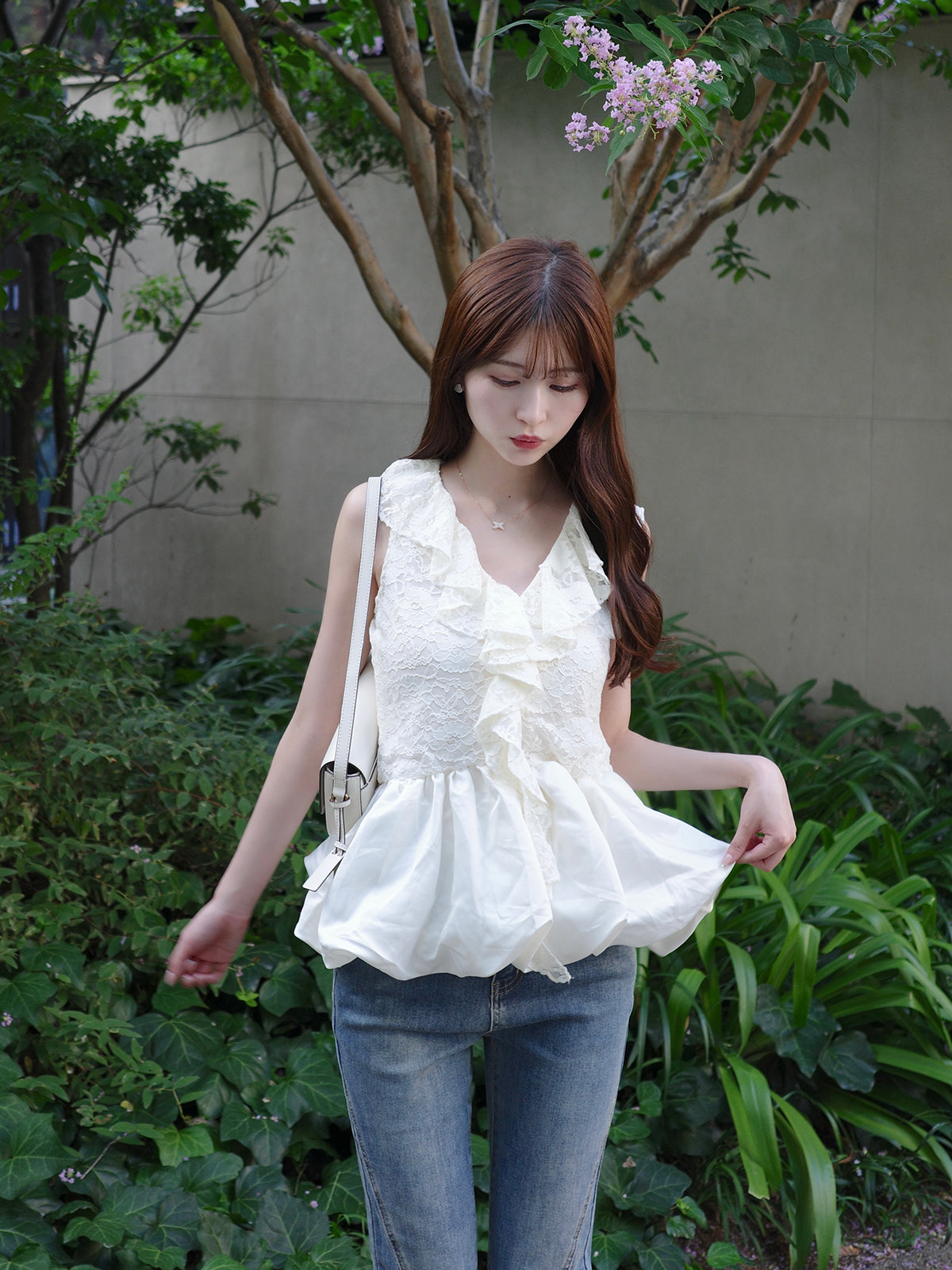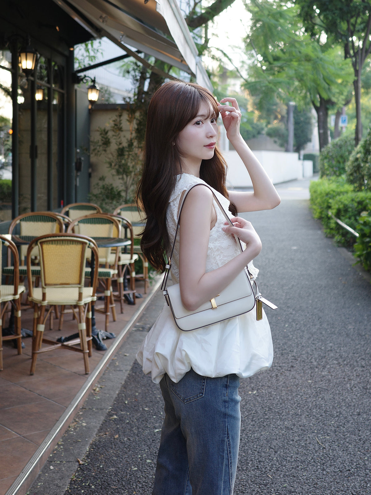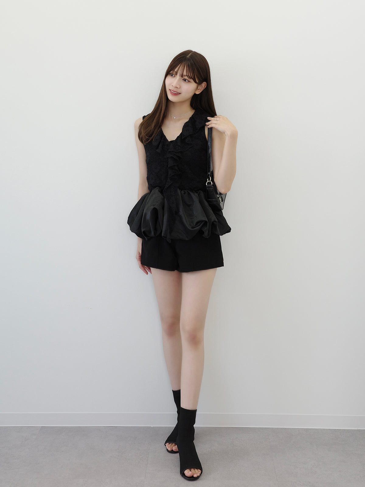 繊細なフラワーレースと、ふんわり広がるバルーンシルエットの裾が目を惹く上品なブラウス。