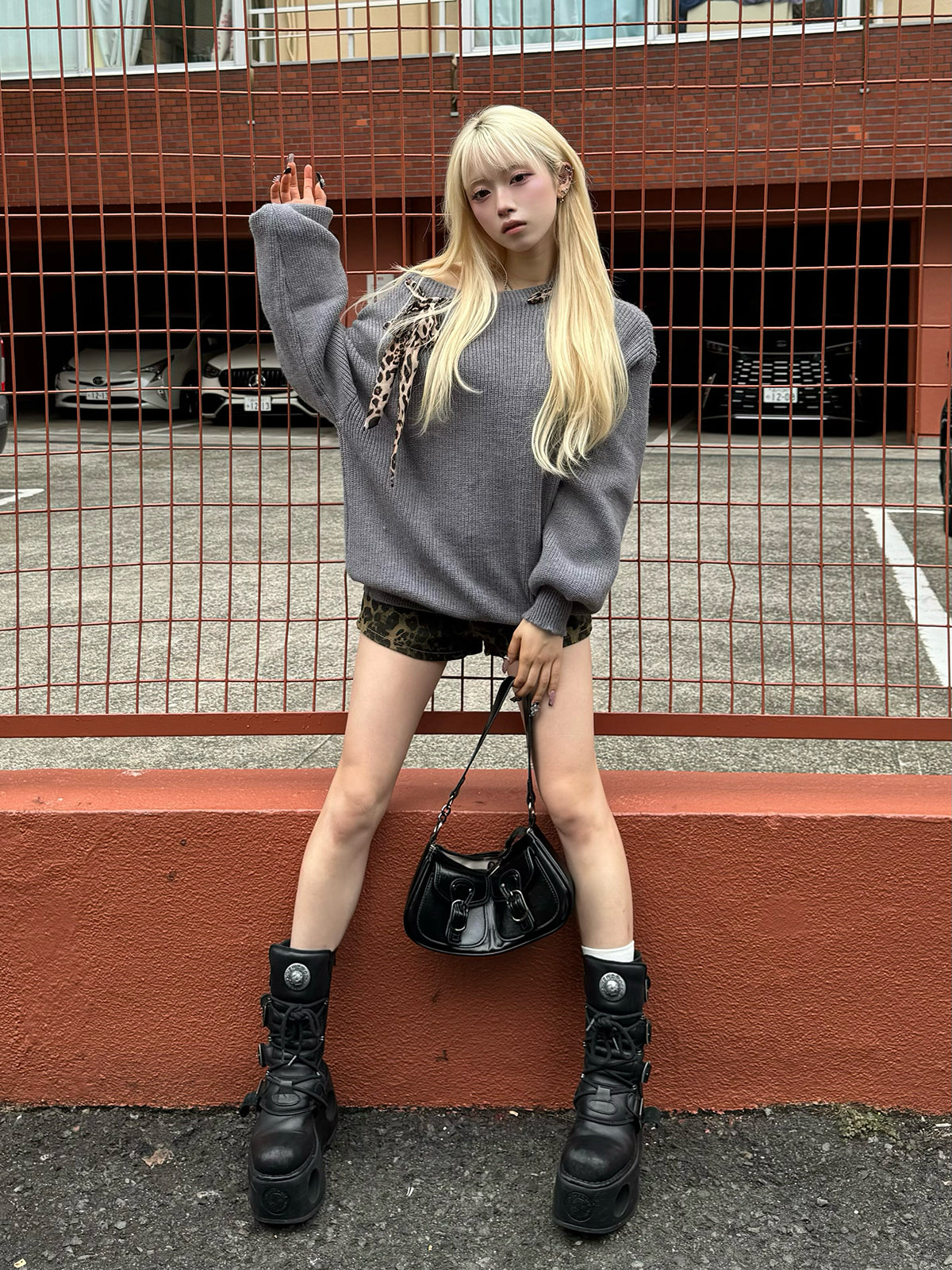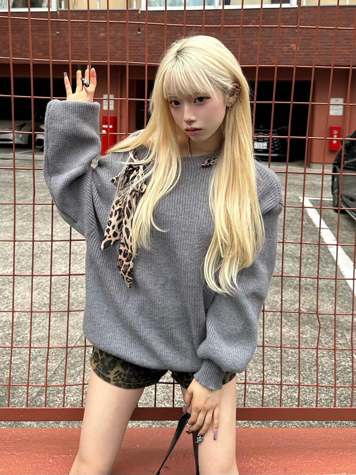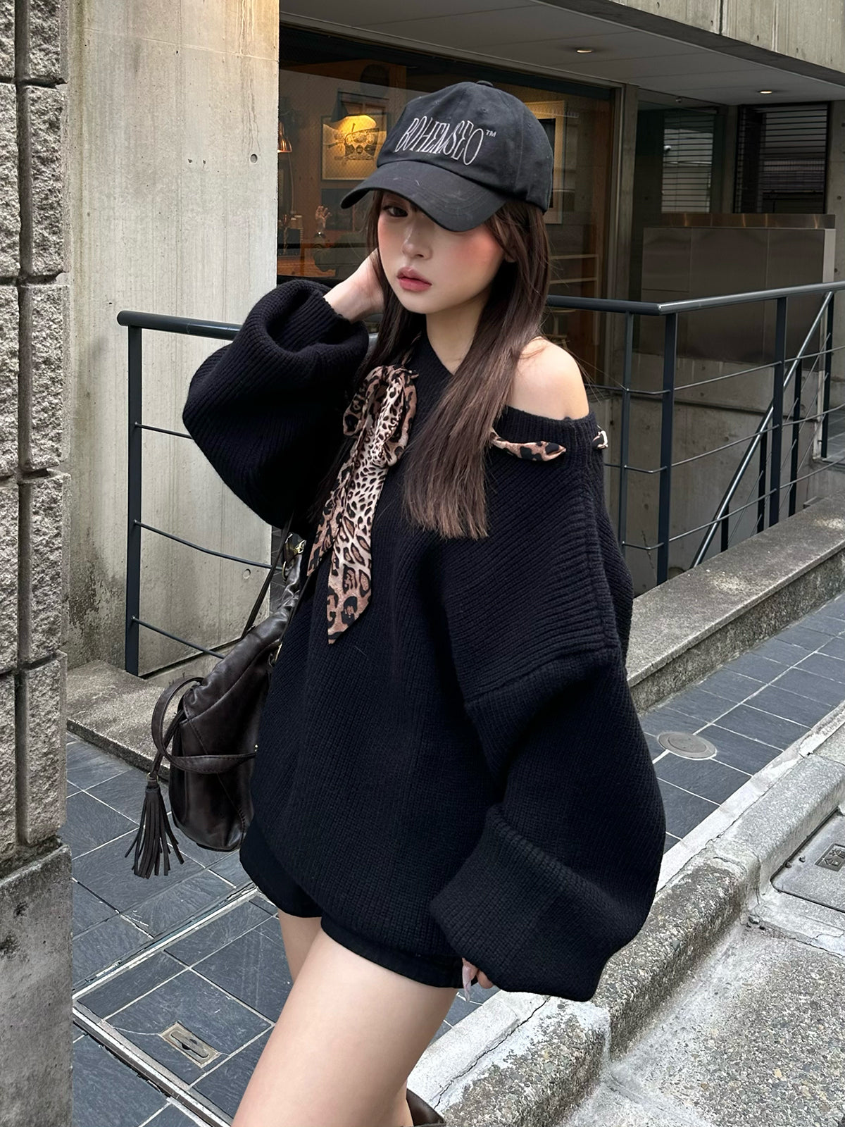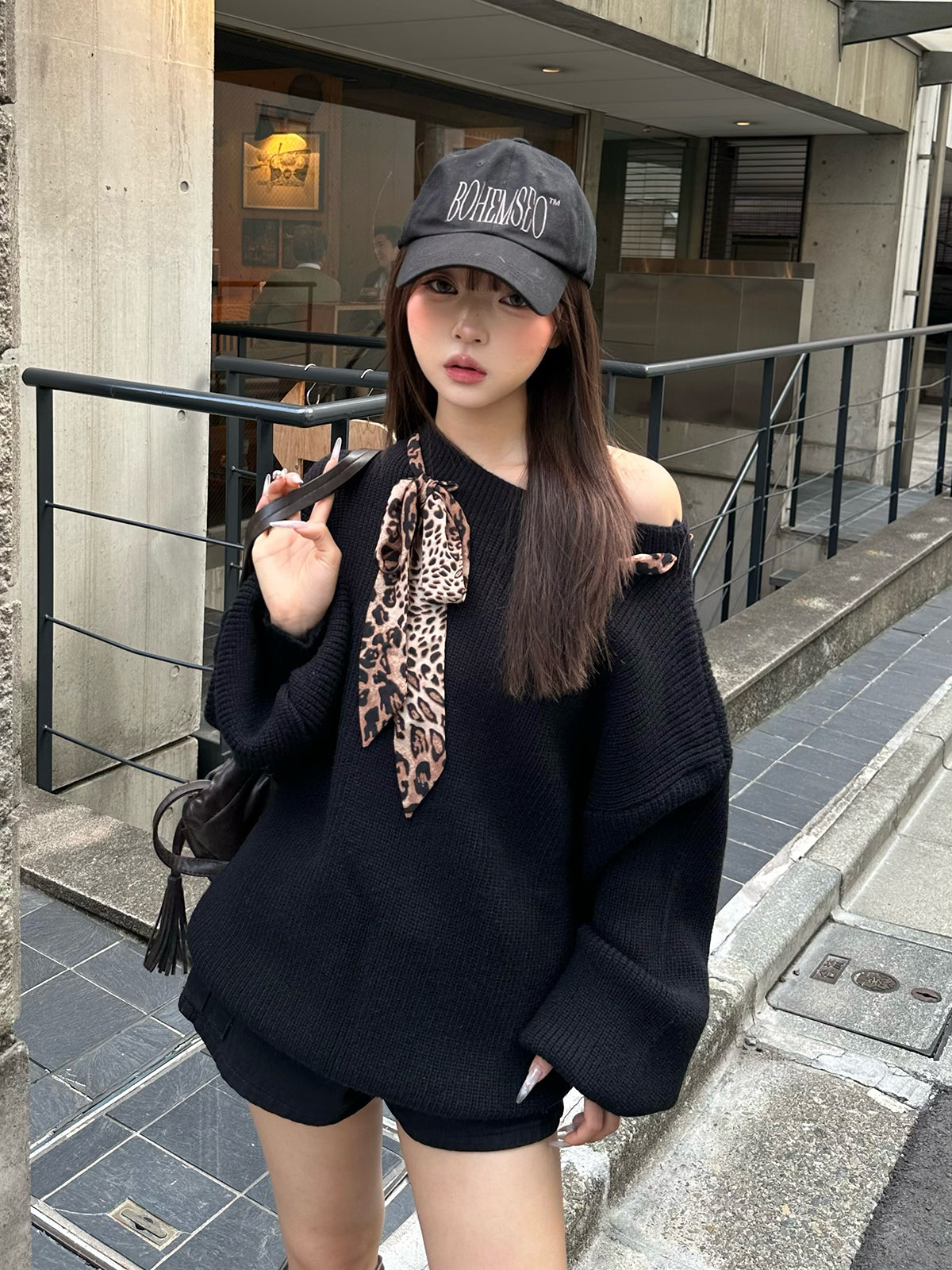 レオパード柄のスカーフが印象的なワンショルダーニット。
