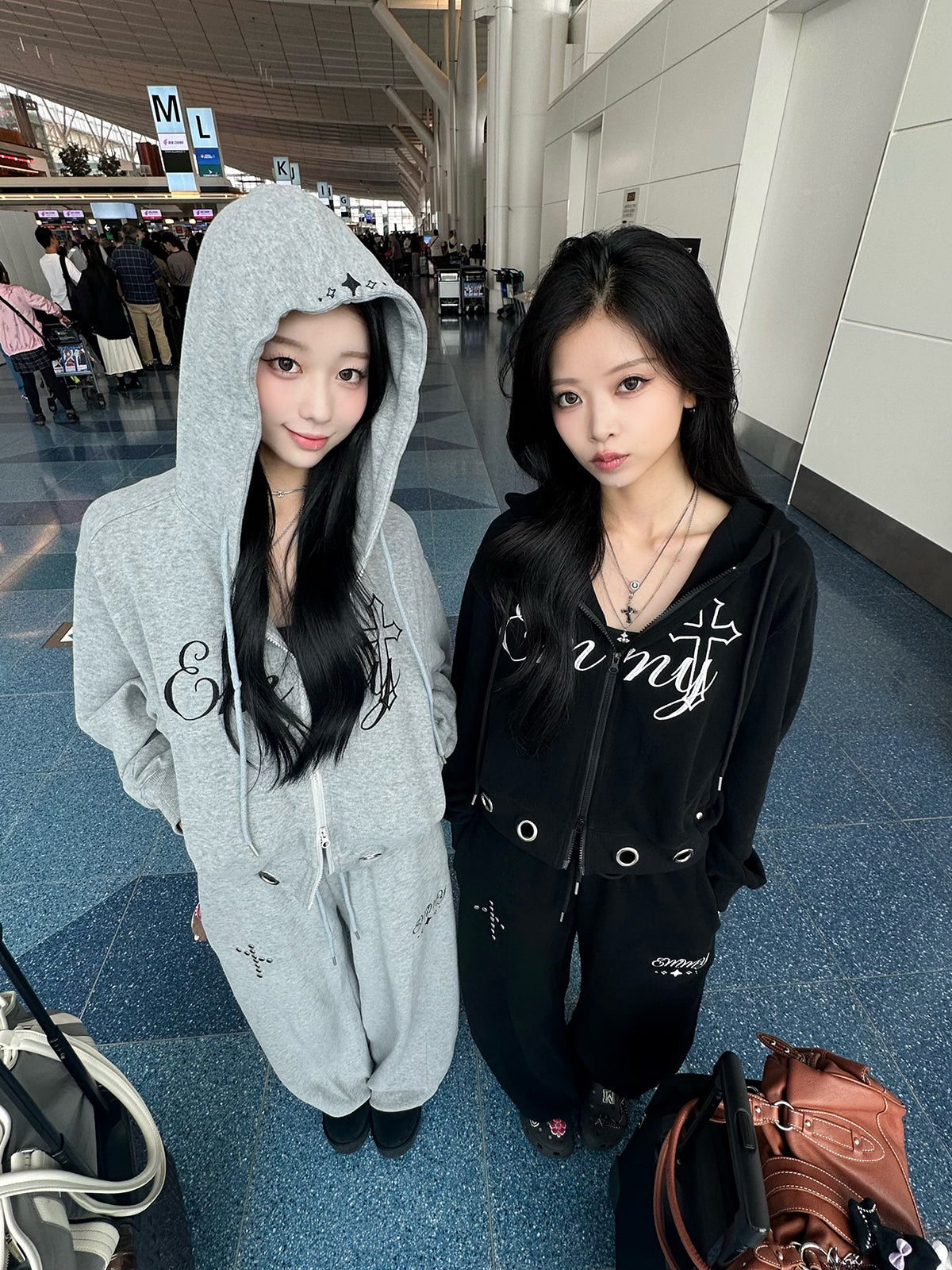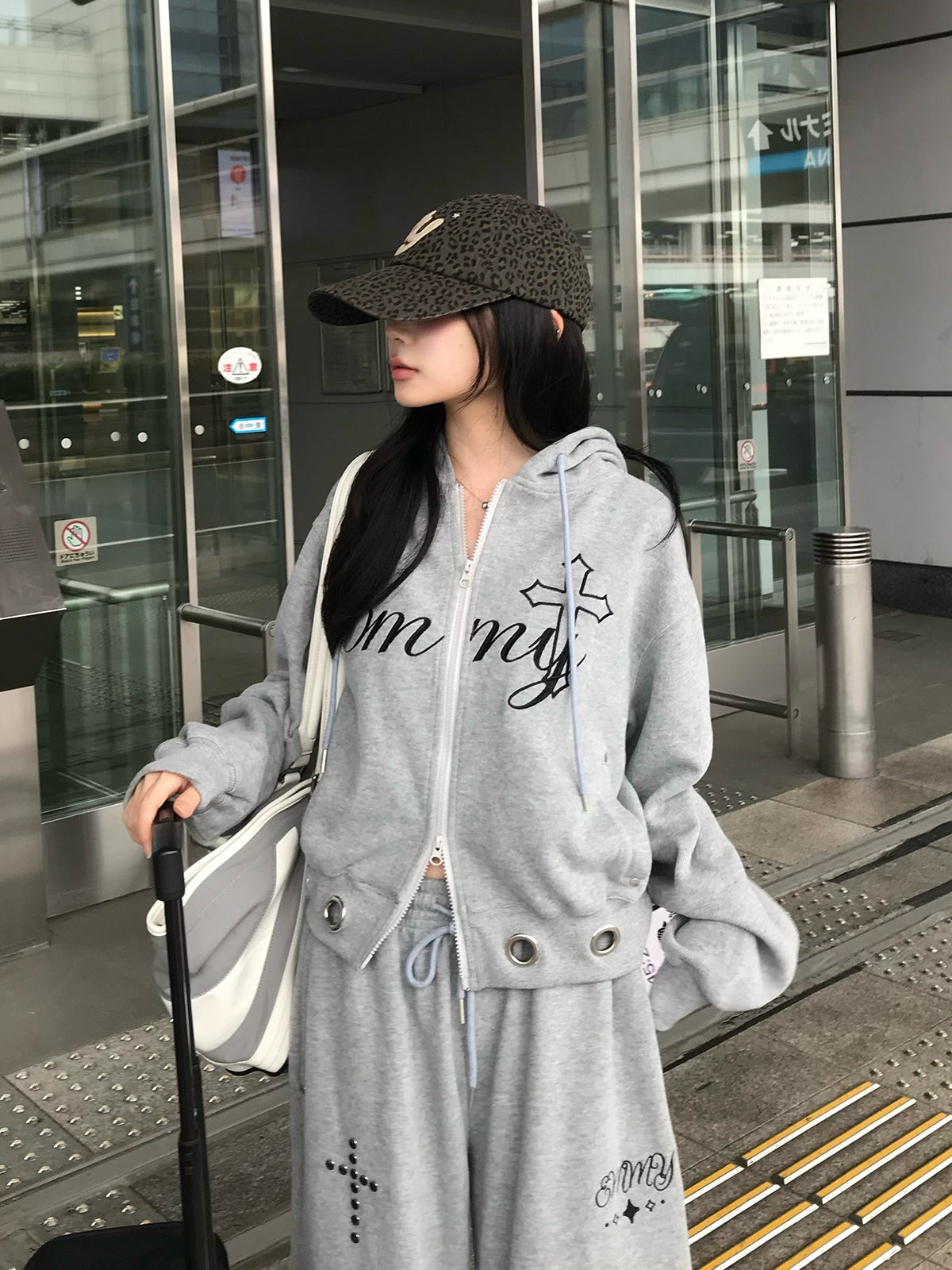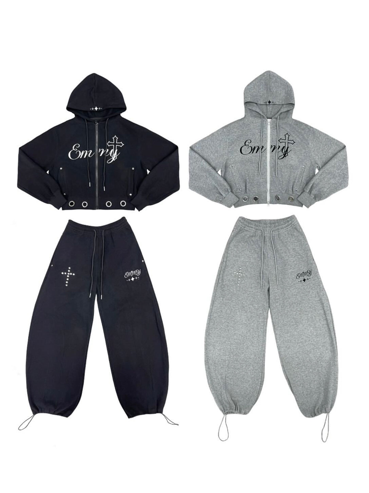ダブルジップパーカーとパンツのスウェットセットアップ。
